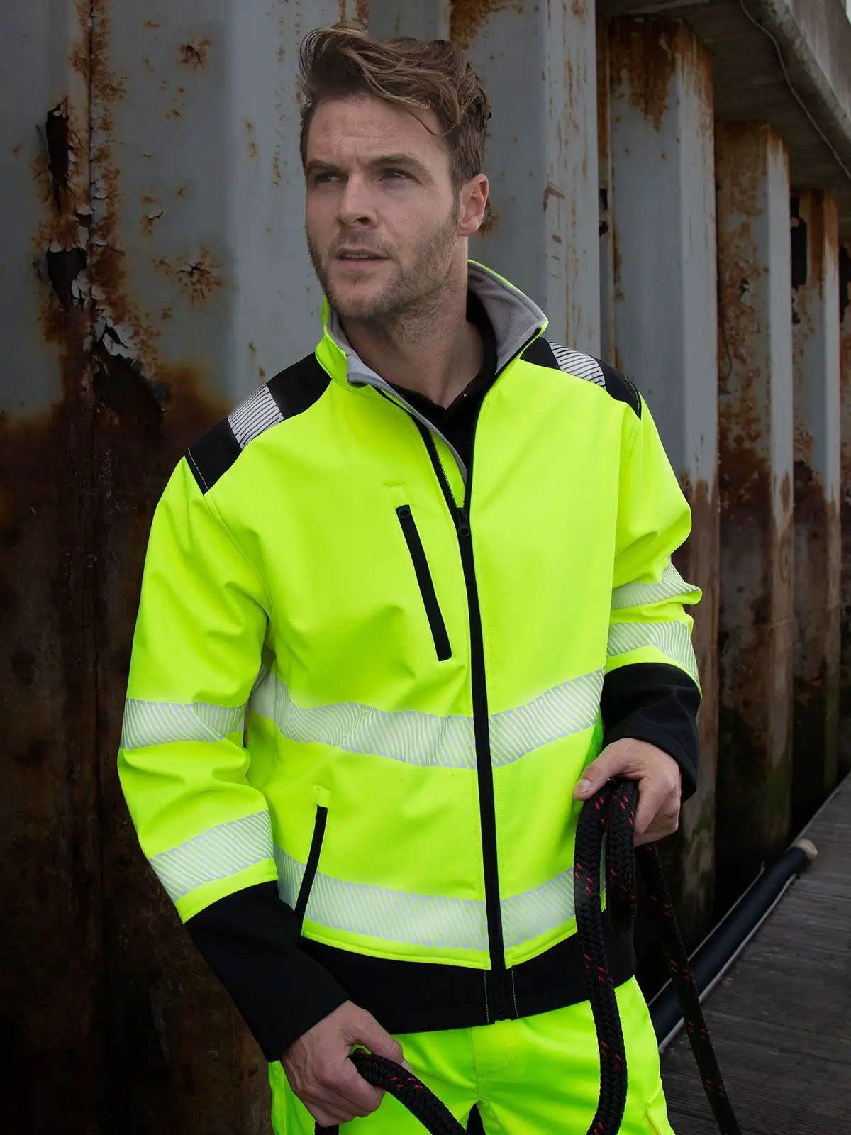 100% poliestere ripstop. Softshell 3 strati. Esterno: 100% poliestere. Strato intermedio: membrana in TPU impermeabile (5000 mm), traspirante (600 g/m² in 24 ore) e antivento. Fodera: 100% poliestere (micropile).