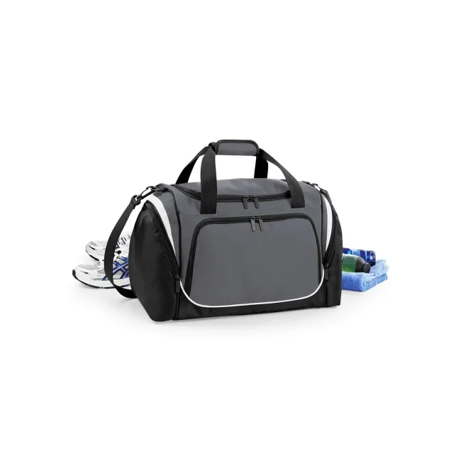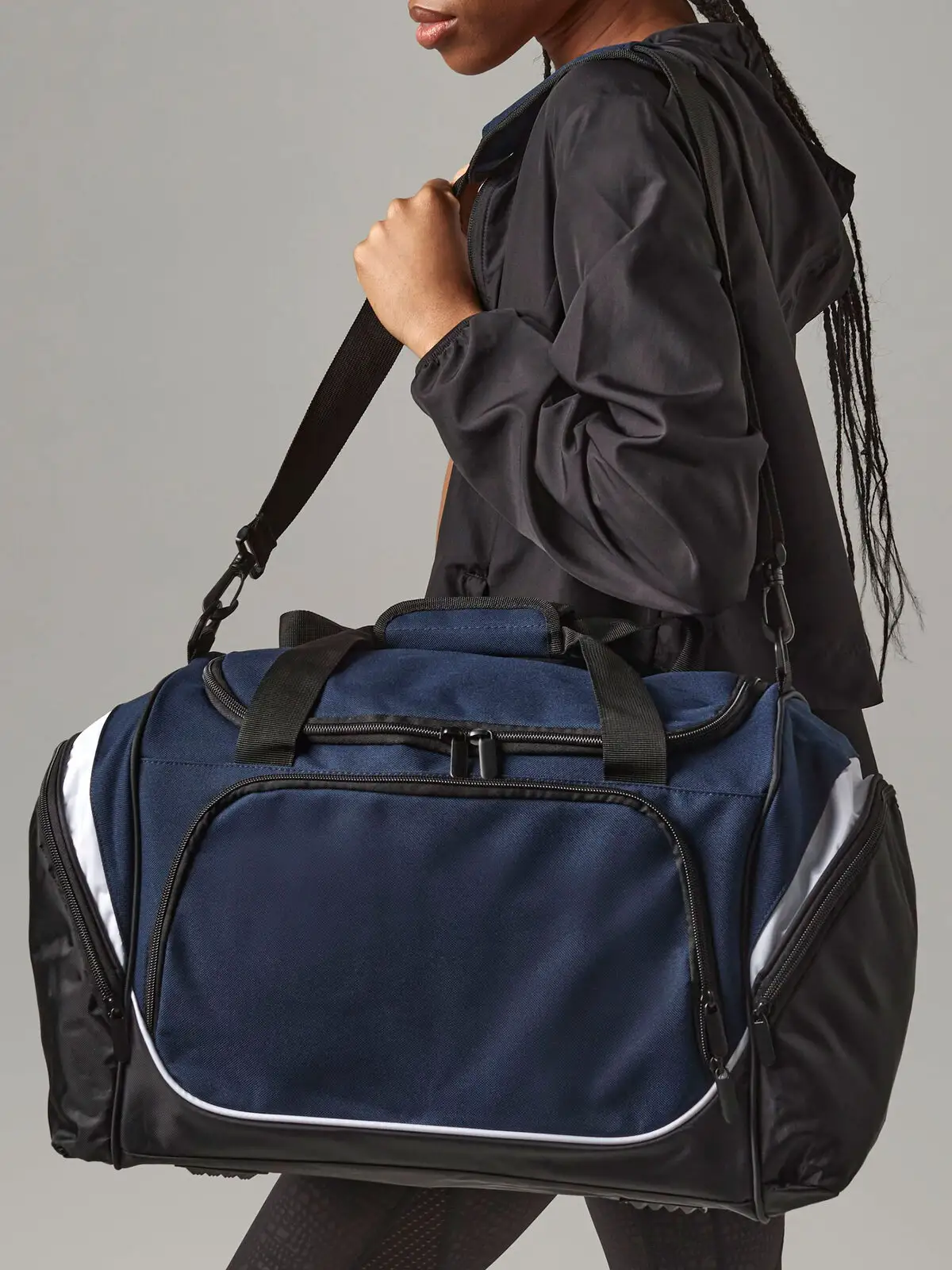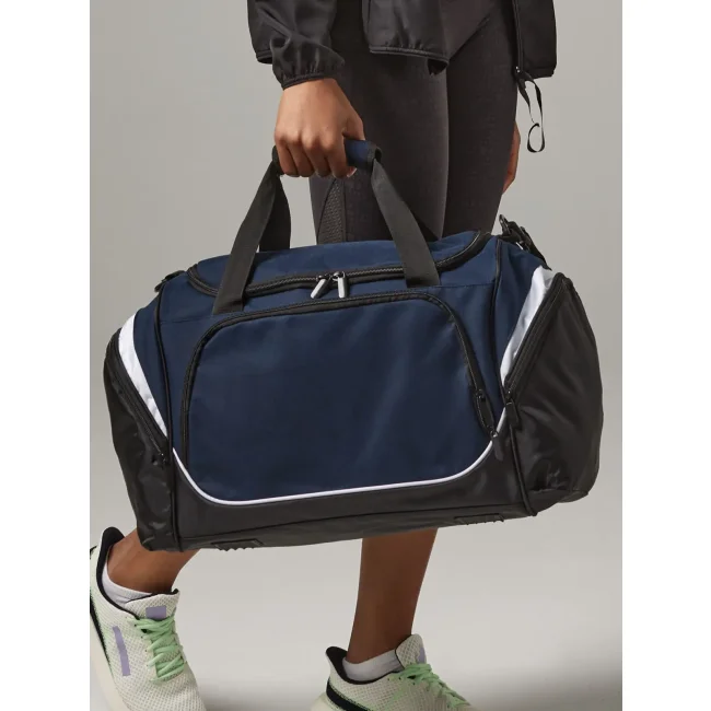 100% Combinazione poliestere 600d/420d. Borsa con tracolla regolabile, doppia tasca laterale e tasca anteriore con zip. Etichetta removibile.