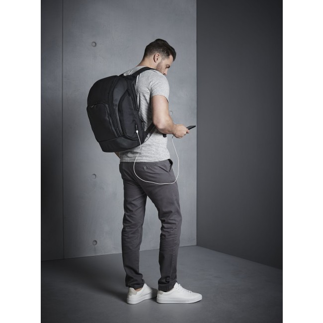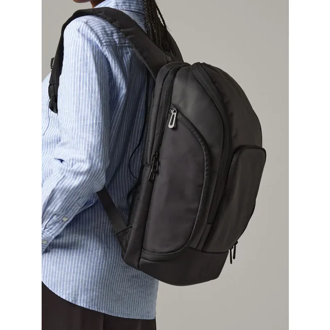 100% combinazione di poliestere rivestito in nylon Jacquard/PU. Zaino per laptop fino a 17", tasca nascosta con chiusura a zip nel pannello posteriore, tasca interna con cerniera, pannello posteriore ergonomico imbottito Dimensioni: 33x48x22 cm, capacità : 25 litri, area di stampa massima: tasca frontale - 14x20 cm, aletta superiore - 18x15 cm.