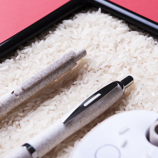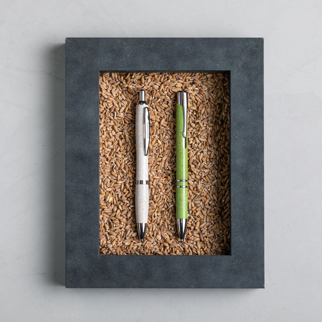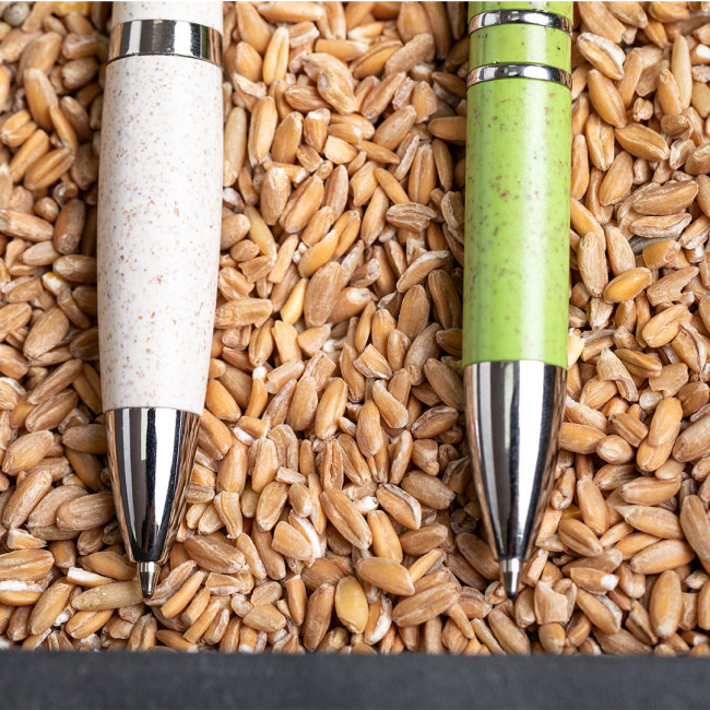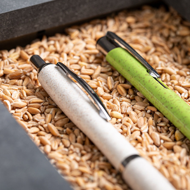 Penna della linea natura con fusto in fibra di grano per promuovere l'uso di materie prime naturali e ridurre le emissioni inquinanti. Meccanismo a pulsante, con dettagli cromati e clip fustellata, cartuccia jumbo e inchiostro blu. Disponibile in un'ampia gamma di colori.