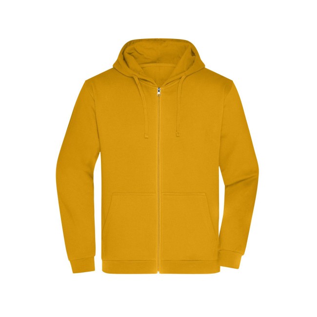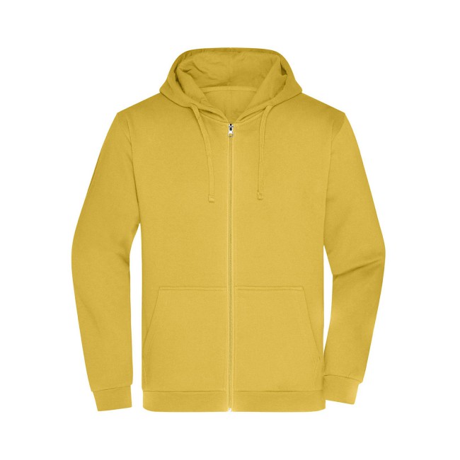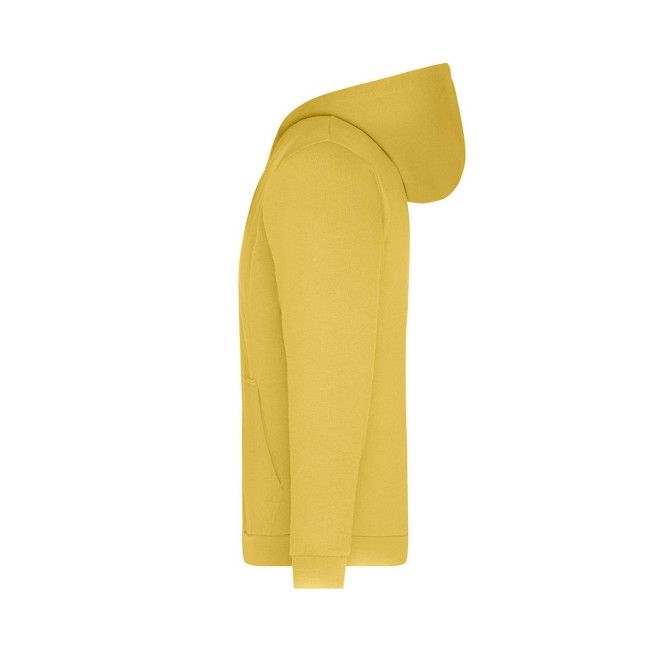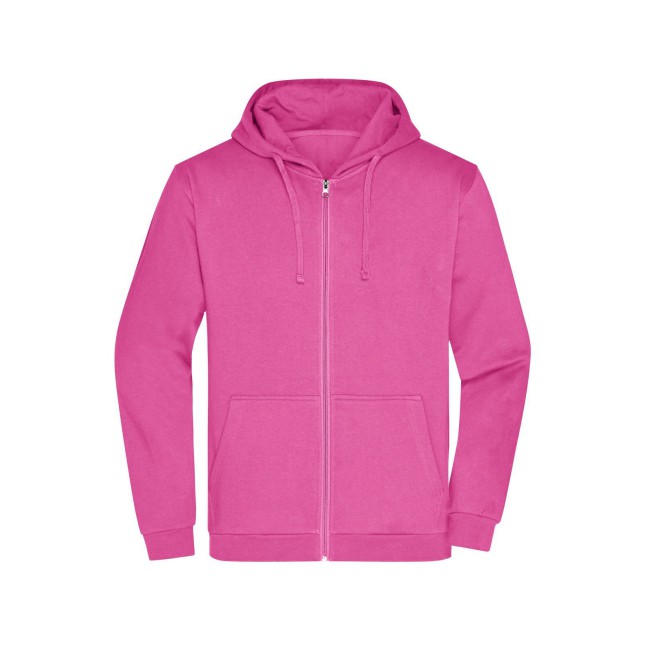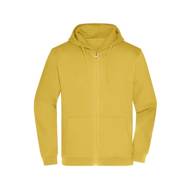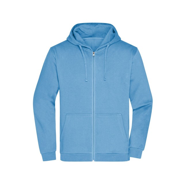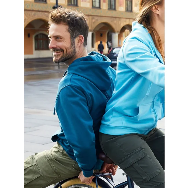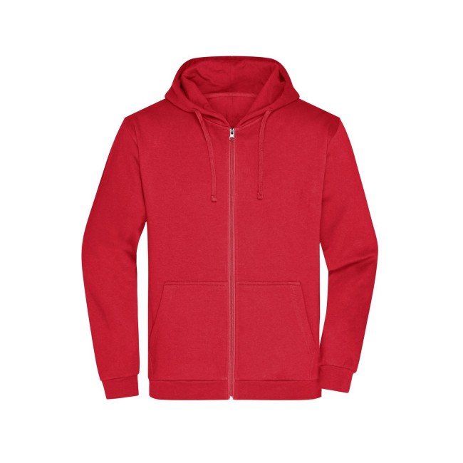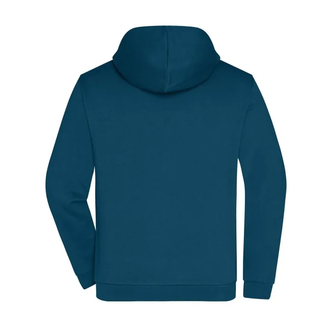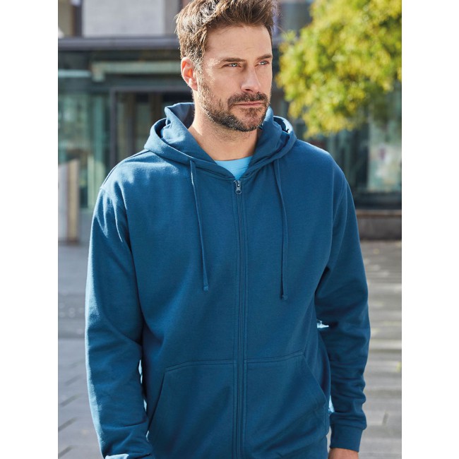 80% cotone, 20% poliestere. Felpa con zip e cappuccio a due strati con cordini, felpata internamente, tasca marsupio, nastro di rinforzo al collo, polsini con elastane, etichetta Tear-off.