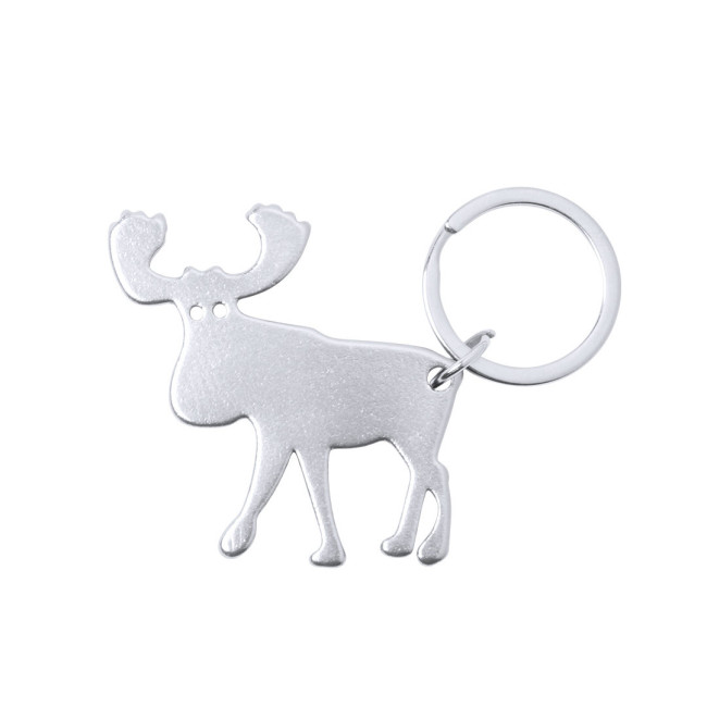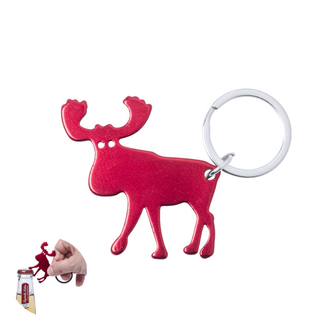 Originale apribottiglia / portachiavi in alluminio. Con disegno di renne natalizie in colori vivaci.