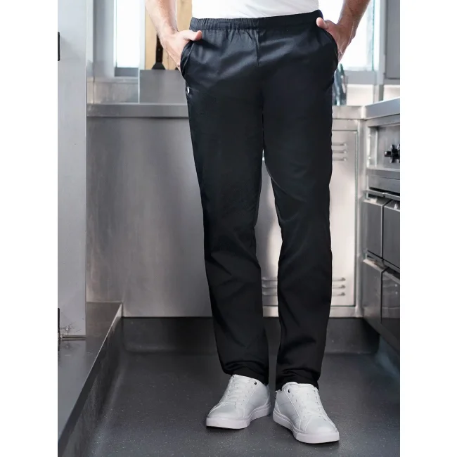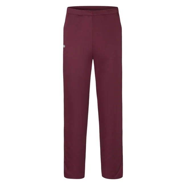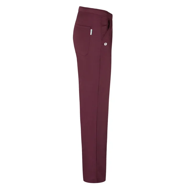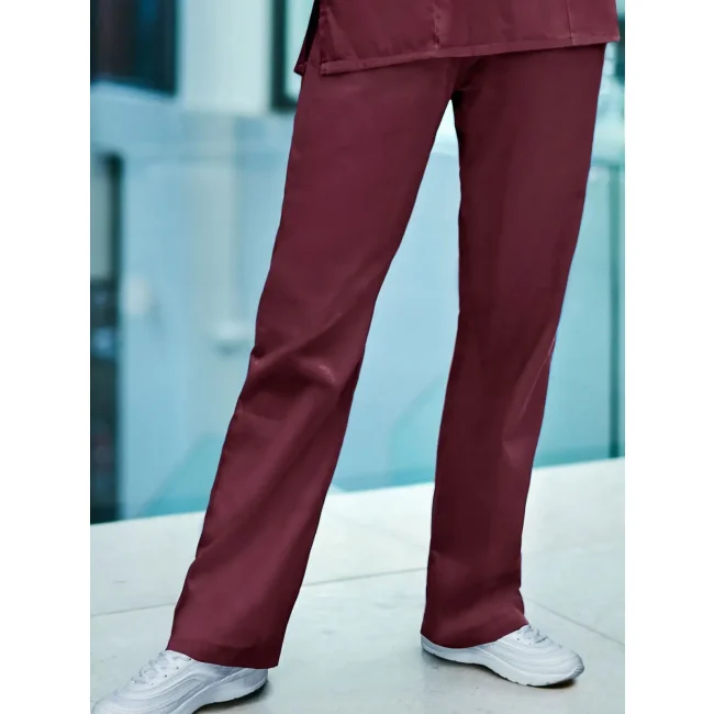 65% poliestere riciclato, 35% cotone. Pantaloni da lavoro unisex comodi e sostenibili, resistenti, elastico in vita, altissima lavabilità a 95°C che garantisce la purezza clinica, vestibilità comoda, altezza della vita normale, pantaloni a gamba dritta, taschini laterali, 1 taschino posteriore destro.