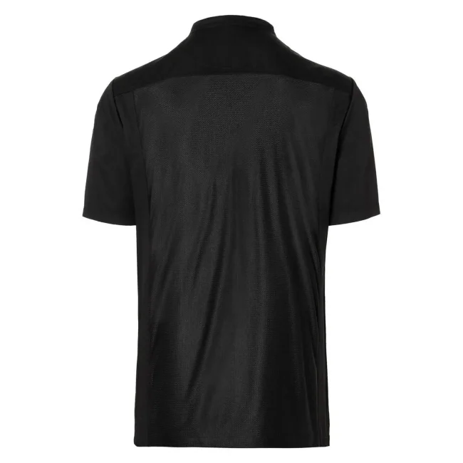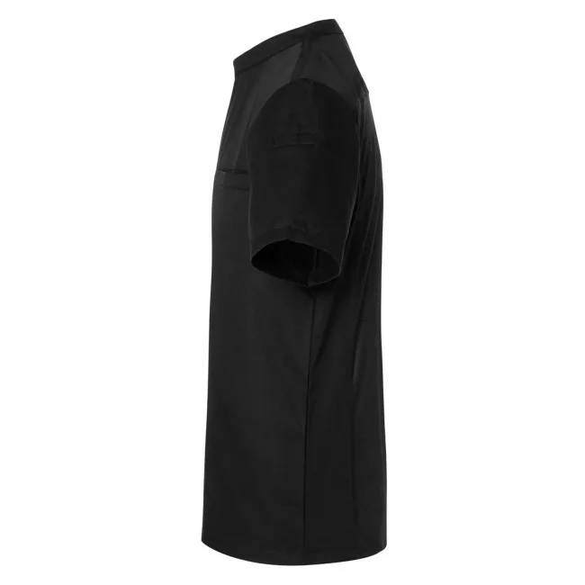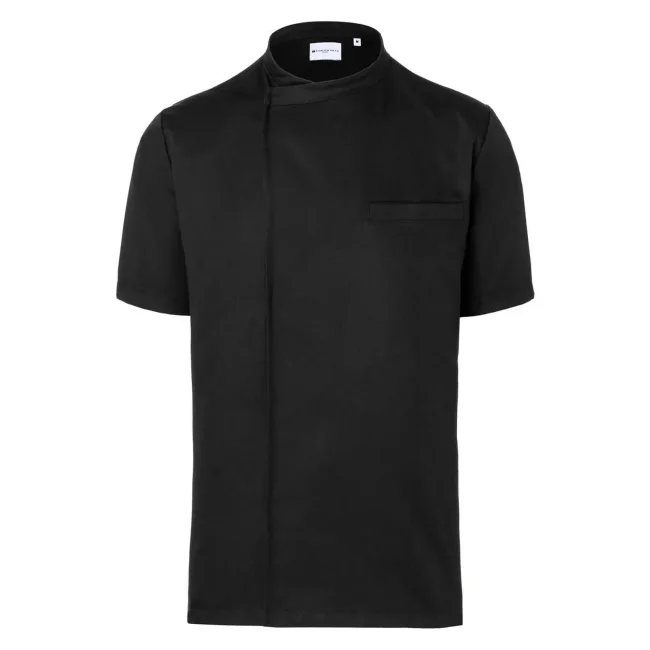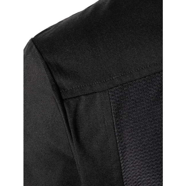 65% poliestere, 35% cotone lato anteriore, 100% poliestere lato posteriore. Camicia moderna da cucina a maniche corte da usare su altri indumenti, con inserto sul retro in tessuto Jersey a rete che garantisce libertà di movimento e traspirabilità, taglio diritto, bottoni a pressione nascosti che possono aumentare la circonferenza della camicia una volta aperti, un taschino a filetto sul lato sinistro del petto e uno sulla manica sinistra. Lavaggio a 60°C.