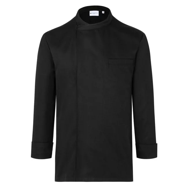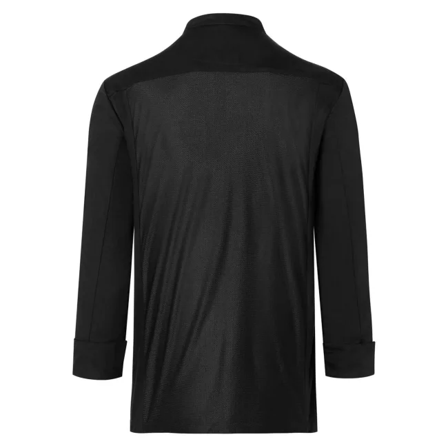 65% poliestere, 35% cotone lato anteriore, 100% poliestere lato posteriore. Camicia moderna da cucina a maniche lunghe da usare su altri indumenti, con inserto sul retro in tessuto Jersey a rete che garantisce libertà di movimento e traspirabilità, taglio diritto, bottoni a pressione nascosti che possono aumentare la circonferenza della camicia una volta aperti, un taschino a filetto sul lato sinistro del petto e uno sulla manica sinistra. Lavaggio a 60°C.