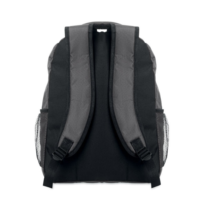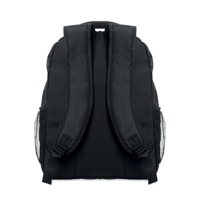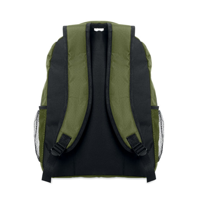 Zaino per laptop da 15 pollici in poliestere 600D RPET con scomparto imbottito per laptop all'interno, tasche in rete su entrambi i lati e tasca frontale con cerniera.