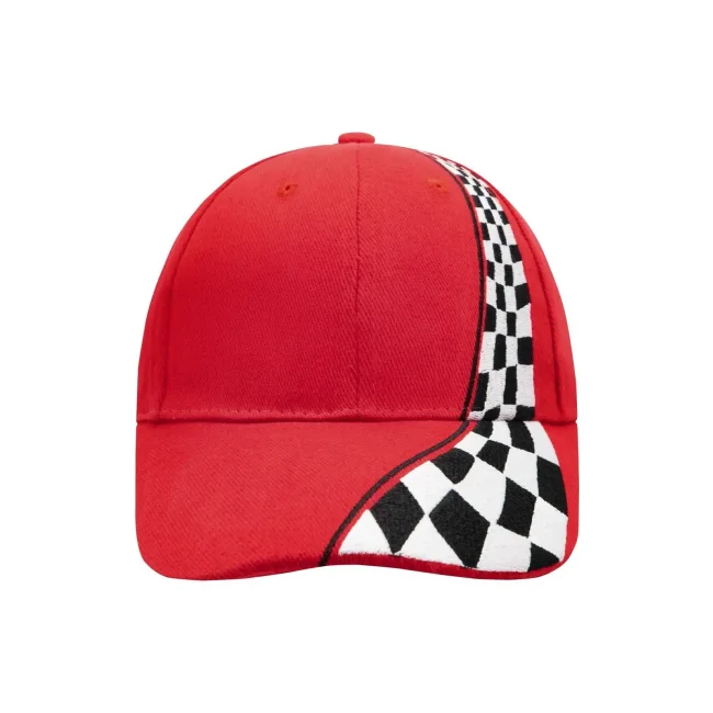 100% cotone. Cap a 6 pannelli di alta qualità in stile racing 6 fori traspiranti imbastiti, Con ricamo elaborato. Pannelli frontali laminati, Fascetta tergisudore imbottita in satin, Chiusura a clip con fibbia in argento mat e asola imbastita, Cotone spazzolato forte ruvido, policromo, Sandwich