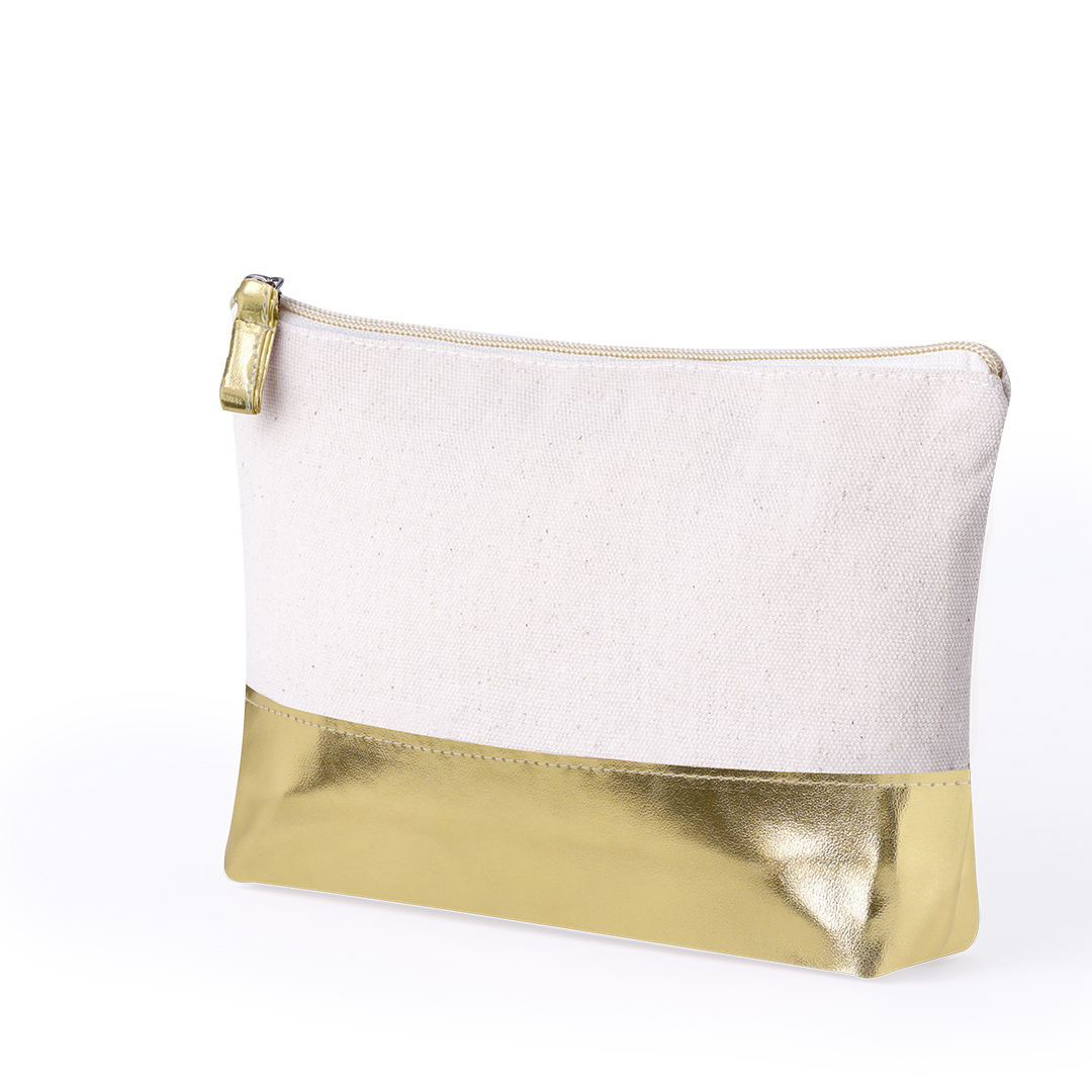 Beauty Case in materiale cotone riciclato da 220 g/m2. Con chiusura a zip in tinta con la base. Disponibile in colore naturale con base in similpelle metallizzata.