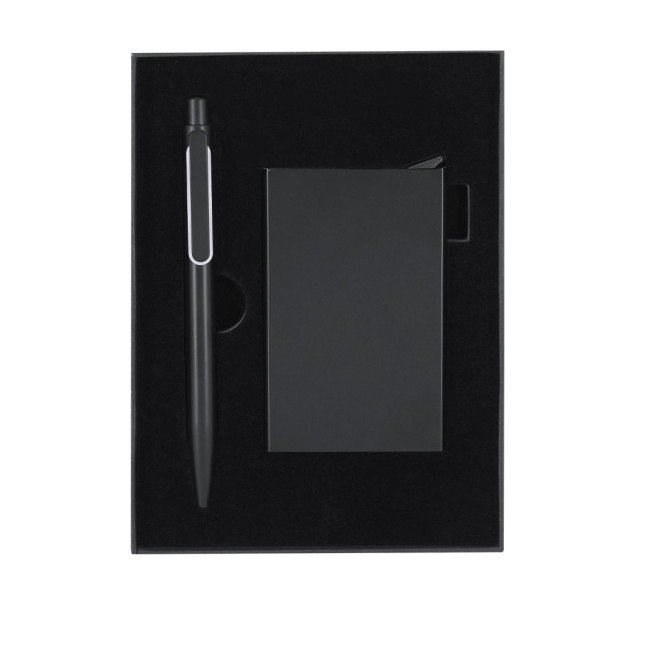 Set di penna e porta biglietti realizzati in Alluminio Riciclato.Il set include:- Penna in nero opaco realizzata in Alluminio Riciclato con meccanismo a pulsante con clip e elemento decorativo in metallo lucido.- Porta biglietti in nero realizzato in Alluminio Riciclato adatto per 6 carte con RFID e meccanismo a pulsante per estrarre le carte.Entrambi con logo di Alluminio Riciclato inciso e presentati in un'elegante scatola nera con interno sagomato.L'Alluminio Riciclato è un materiale con possibilità di riciclo quasi infinite, senza perdere le sue proprietà originali e consumando meno energia in questo processo.Certificazione GRS (Global Recycled Standard / Standard di Riciclo Globale), che garantisce l'origine riciclata del materiale utilizzato per realizzare il prodotto.