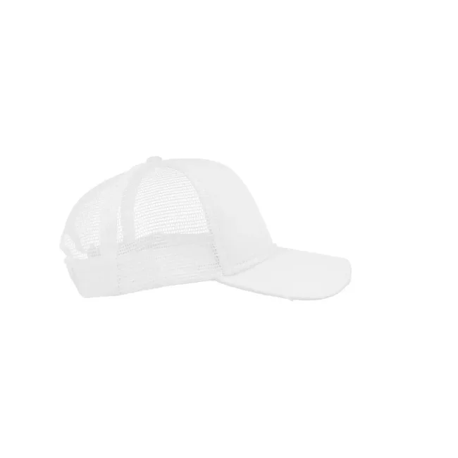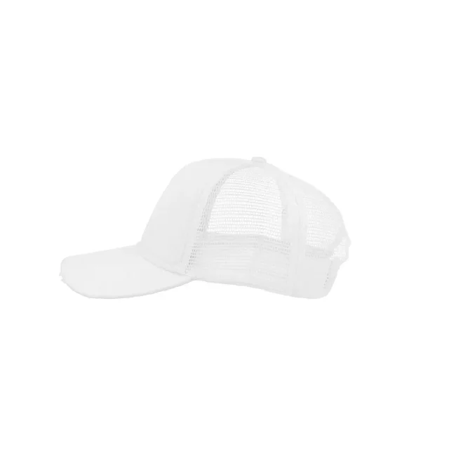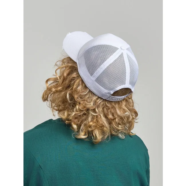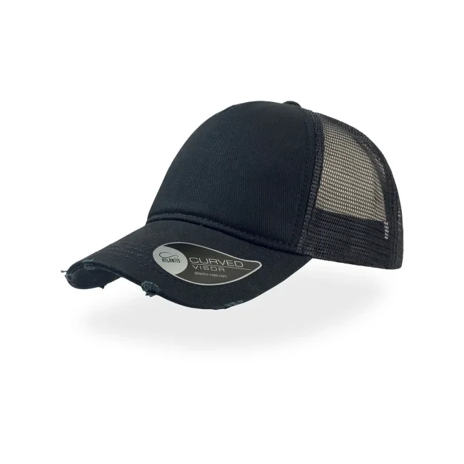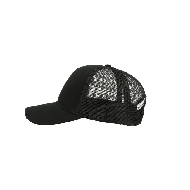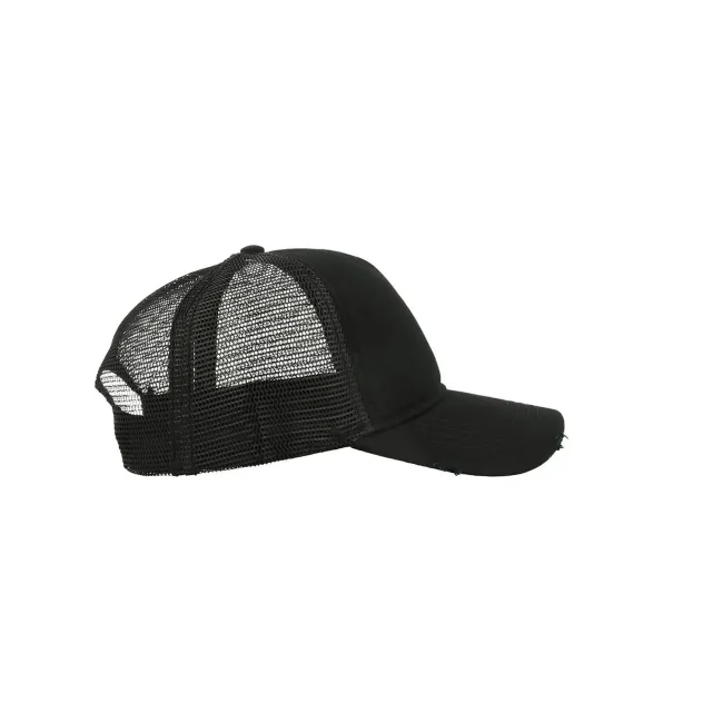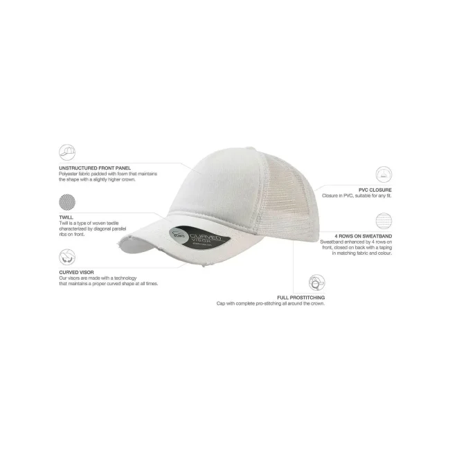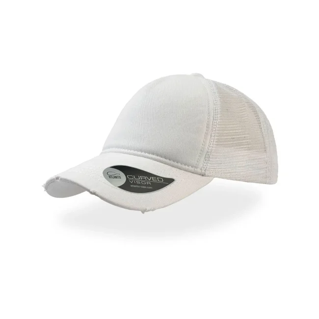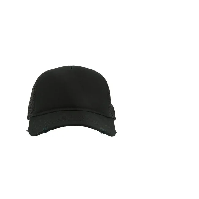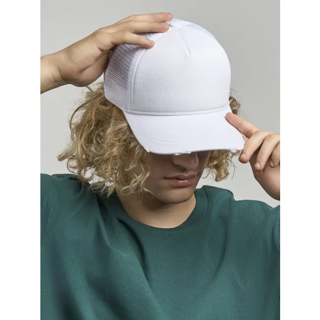 100% cotone. Trucker cap a 5 pannelli, mesh posteriore e laterale, visiera destroyed pre-curvata, pannello frontale non strutturato, ideale per la stampa, 4 cuciture su visiera, parasudore in cotone, etichetta removibile.