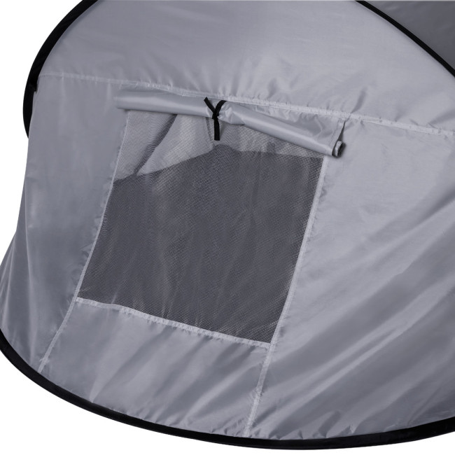 Tenda automontante, basta estrarla dalla copertura e si dispiega automaticamente. Realizzata in resistente poliestere RPET, con struttura in metallo e dettagli neri. Ampia porta d'ingresso, con chiusura a zip e doppia maniglia interna ed esterna. Finestra sul retro con zanzariera, chiusura a velcro e tenda avvolgibile con cordino e cinghia di fissaggio. Ideale per 2 persone e facile da piegare. Confezionata in una custodia coordinata, con etichetta RPET all'esterno.Il materiale RPET è realizzato con plastica riciclata per incoraggiare il riutilizzo dei rifiuti plastici e contribuire alla sostenibilità del pianeta.