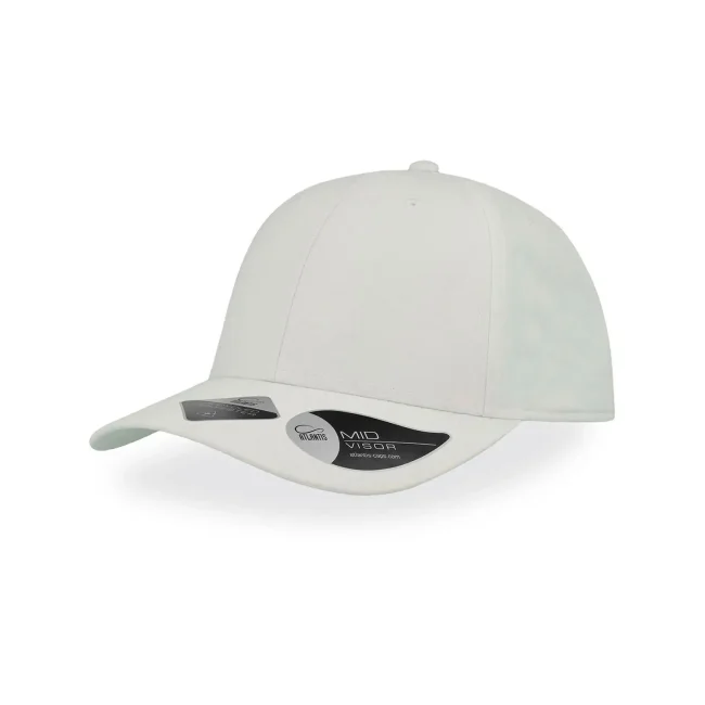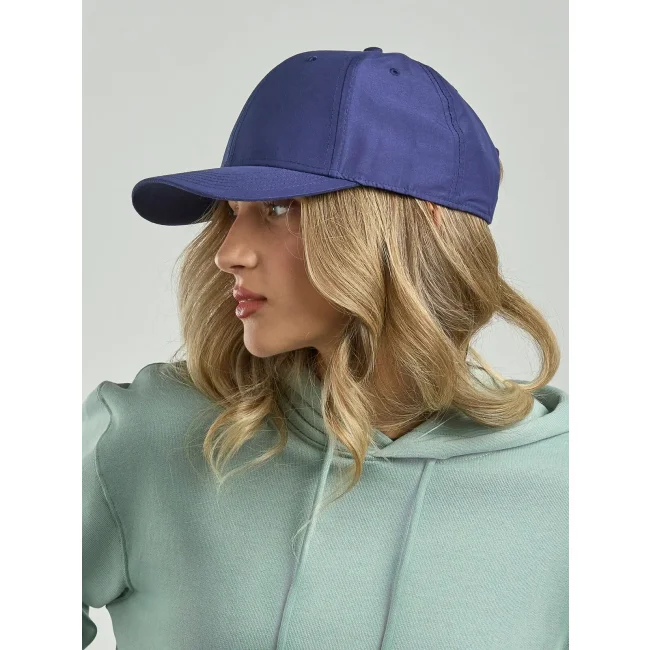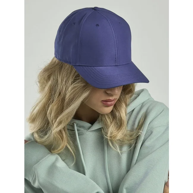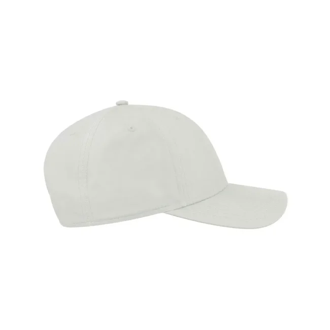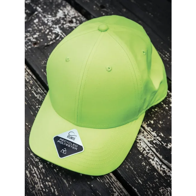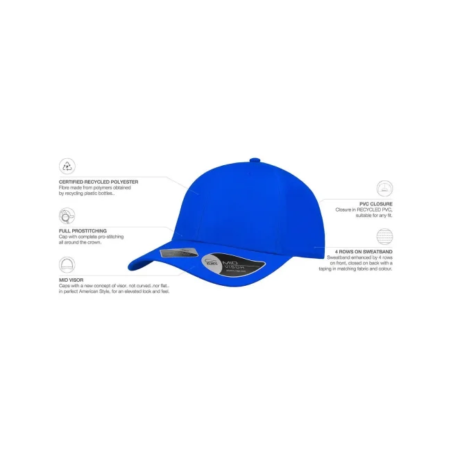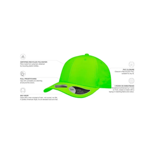 100% poliestere Twill riciclato. Cappellino a 6 pannelli, visiera precurvata, occhielli ricamati, 6 cuciture sulla visiera, etichetta removibile, chiusura in PVC.