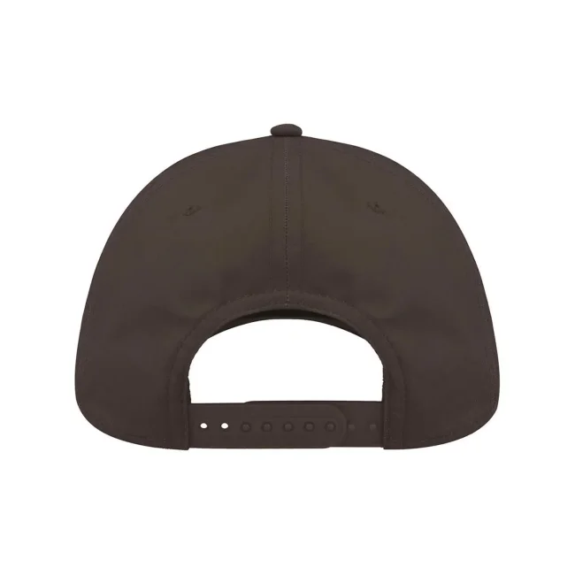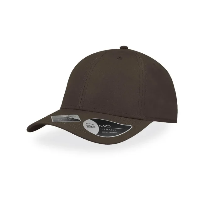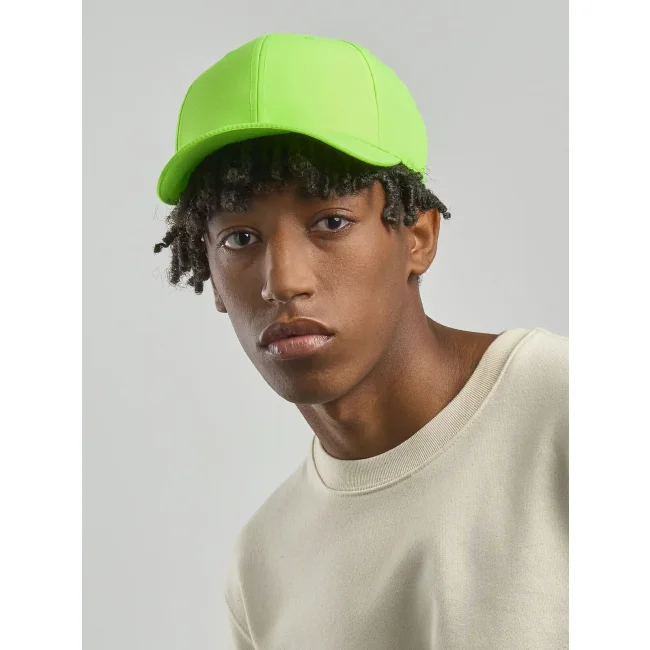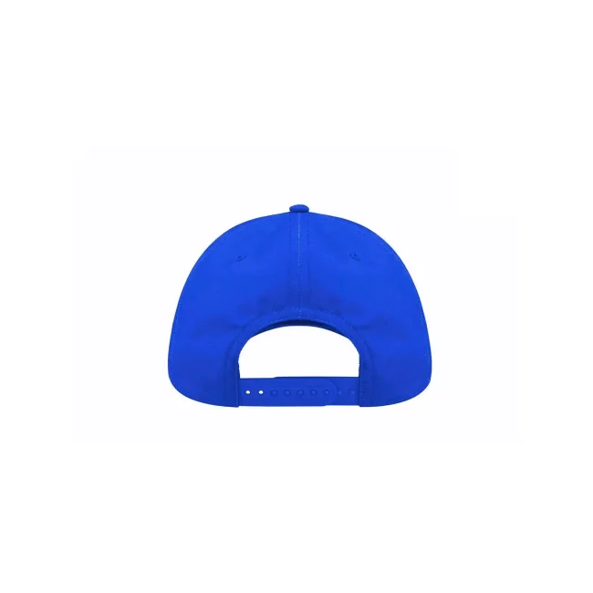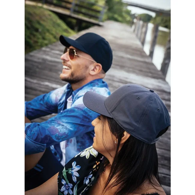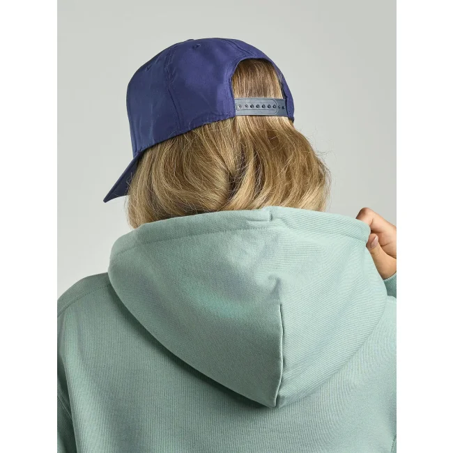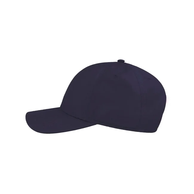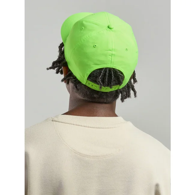 100% poliestere Twill riciclato. Cappellino a 6 pannelli, visiera precurvata, occhielli ricamati, 6 cuciture sulla visiera, etichetta removibile, chiusura in PVC.