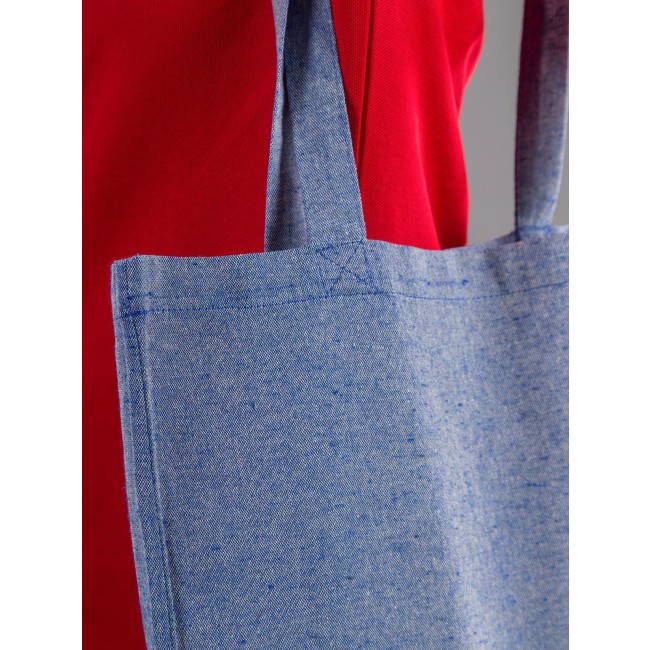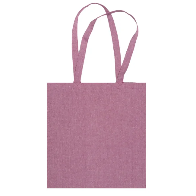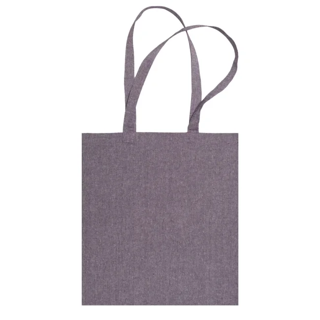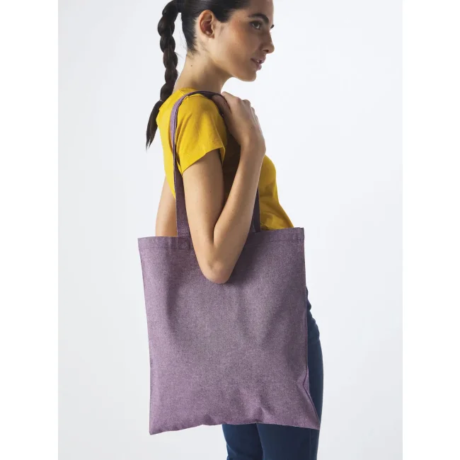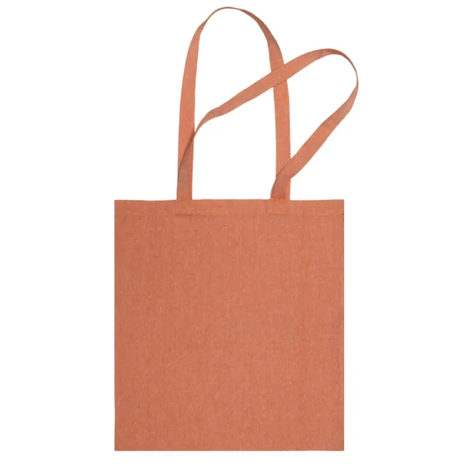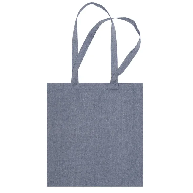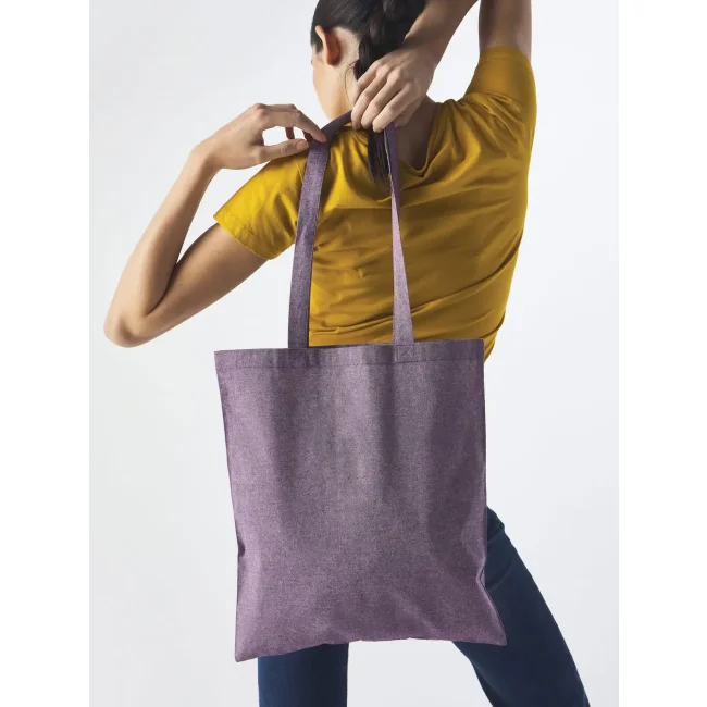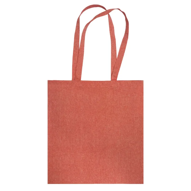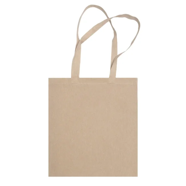 Cotone riciclato. Shopper ecosostenibile in cotone riciclato, manico lungo 67 cm, prodotto stirato per una migliore stampabilità. Etichetta removibile. Dimensione: 38 x 42 cm. Area stampabile: 26 x 30 cm.