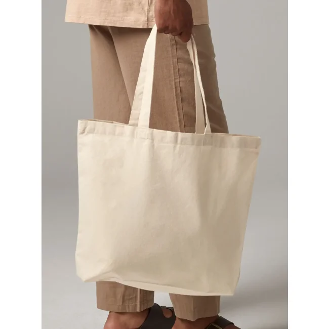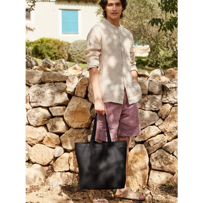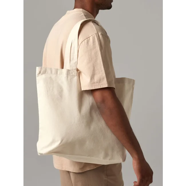 100% cotone riciclato. Borsa realizzata in 100% cotone riciclato, grande capienza. Può essere portata a mano o in spalla. Etichetta removibile. Cotone riciclato GRS, certificato da Control Union CU811033.