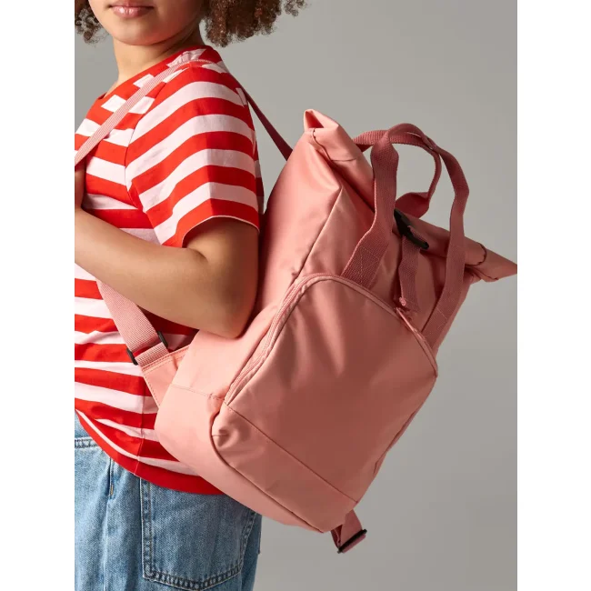 100% poliestere 600D riciclato rPET, equivalente a circa 6 bottiglie post-consumo. Zaino con chiusura roll-top, tasca frontale personalizzabile , tasca esterna per bottiglie. Pannello posteriore imbottito, maniglie in fettuccia, spalline regolabili. Etichetta removibile.