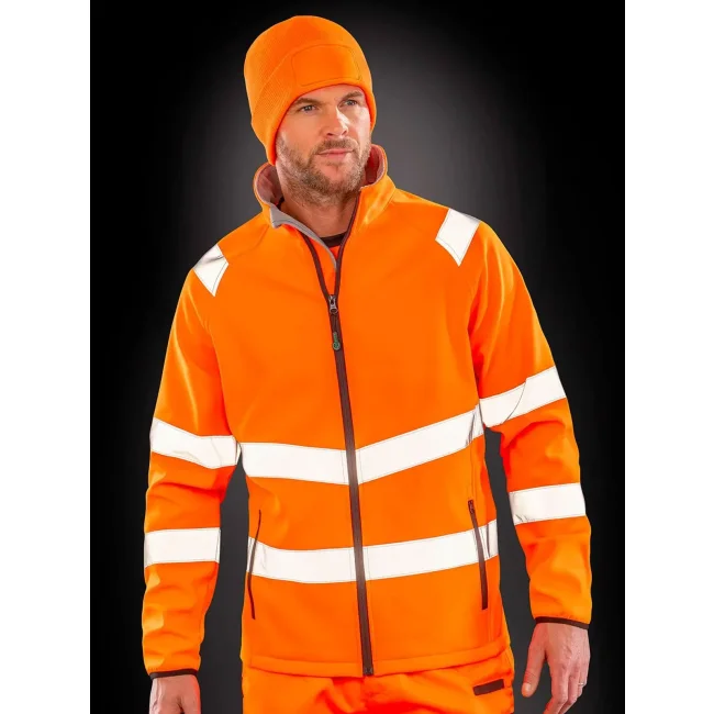 Tessuto esterno: 100% poliestere riciclato, Tessuto interno: 100% poliestere micropile. Softshell a 2 strati. chiusura con zip frontale con protezione del mento e chiusura lampo, strisce di sicurezza da 50mm cucite sul corpo, polsini elasticizzati neri, cuciture decorative, tasche laterali con zip. Resistente all'acqua, traspirante e antivento. Etichetta strappabile.