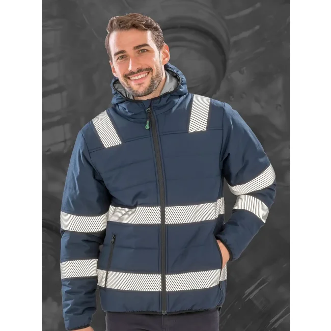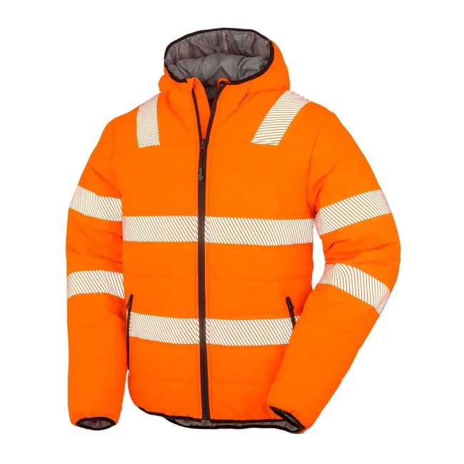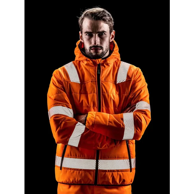 100% poliestere riciclato rip-stop con TPU. Imbottitura: 100% pol. ric. REPREVE. Rivestimento: 100% pol. ric. Giacca di sicurezza imbottita con finitura idrorepellente, zip YKK con protezione per il mento, orli elasticizzati, strisce di sicurezza stampate, tasche frontali con zip, cappuccio imbottito, tasca interna, PFOA free. EN ISO 20471: 2013+A1:2016 Class 2/RIS-3279-TOM Class 2 (arancione).