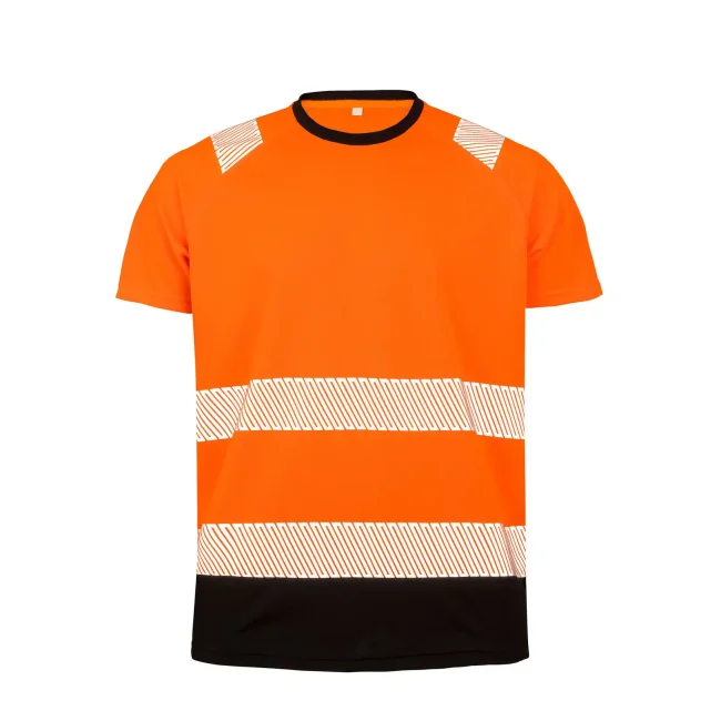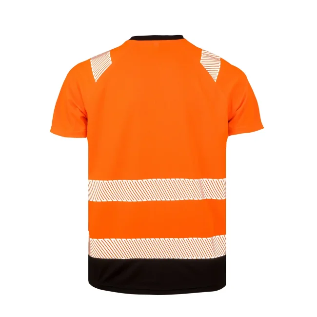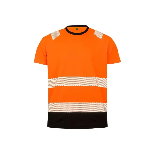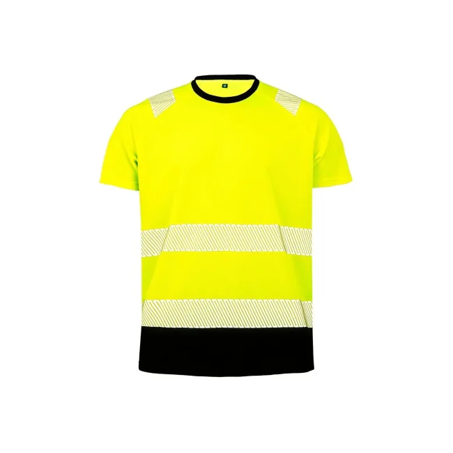 100% poliestere riciclato, colletto 100% poliestere. T-shirt di sicurezza elasticizzata e traspirante con dettagli riflettenti sulle spalle, strisce di sicurezza stampate, collo elastico a costine, traspirante e ad asciugatura rapida, colletto e orlo inferiore di colore nero. EN ISO 20471:2013+A1:2016 Class 2.