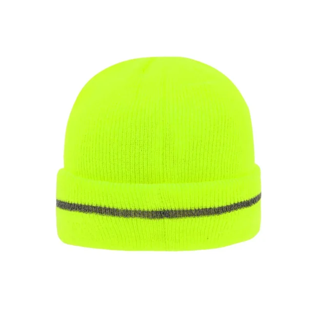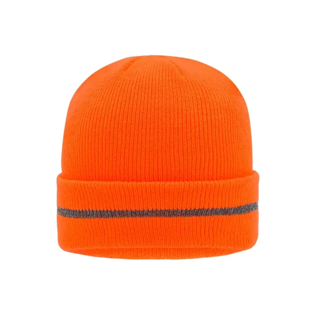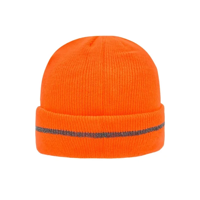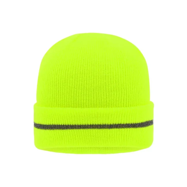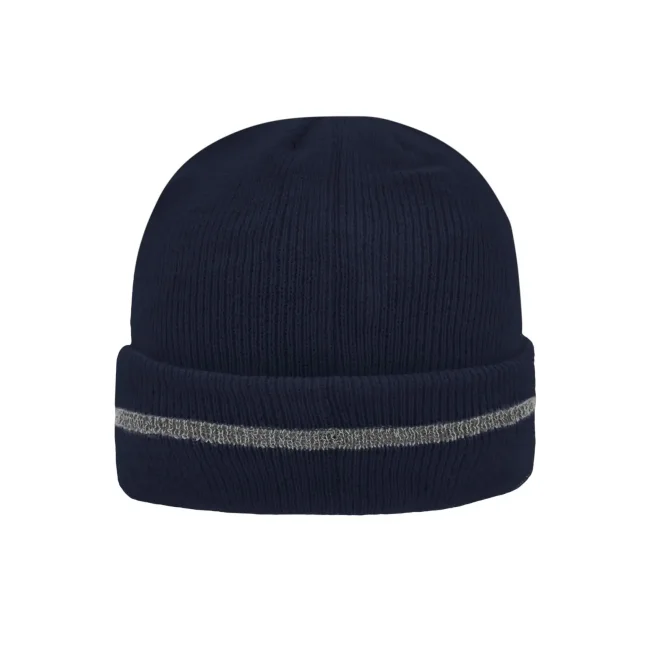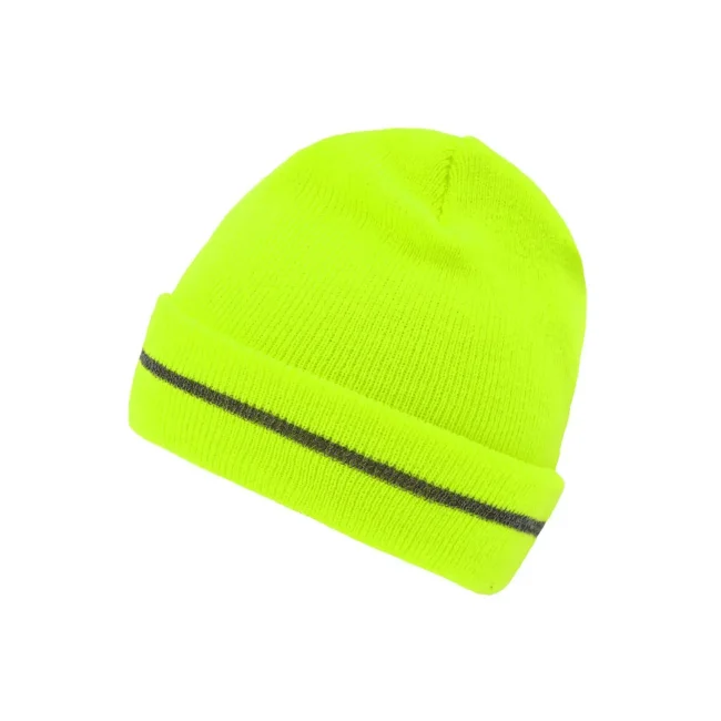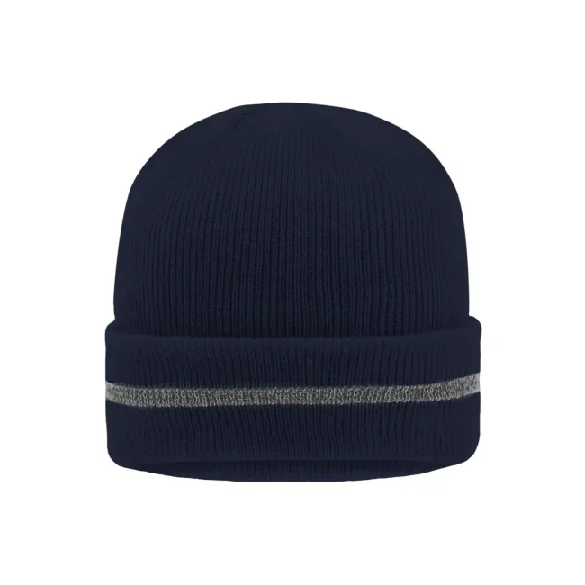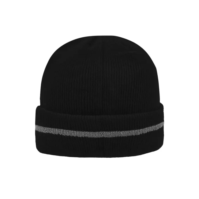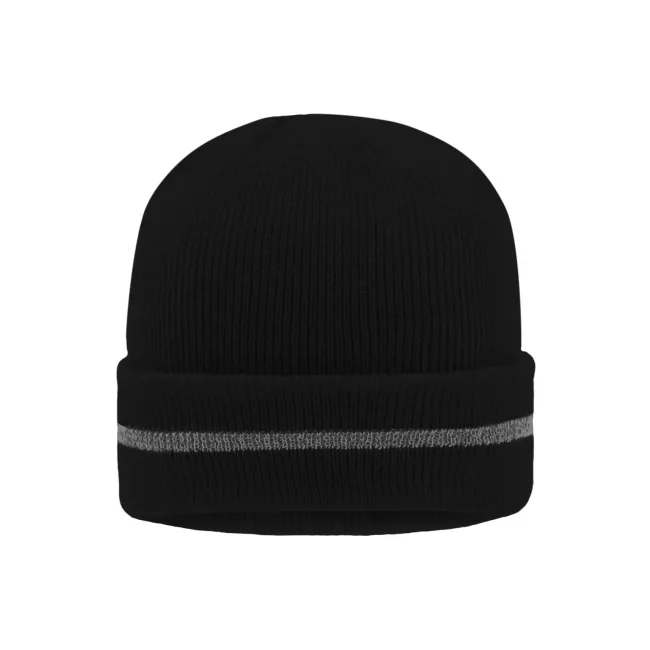 100% poliacrilico. Berretto lavorato a maglia con striscia riflettente sull'orlo (senza funzione protettiva / nessun DPI), maglia a doppio strato.