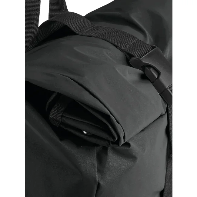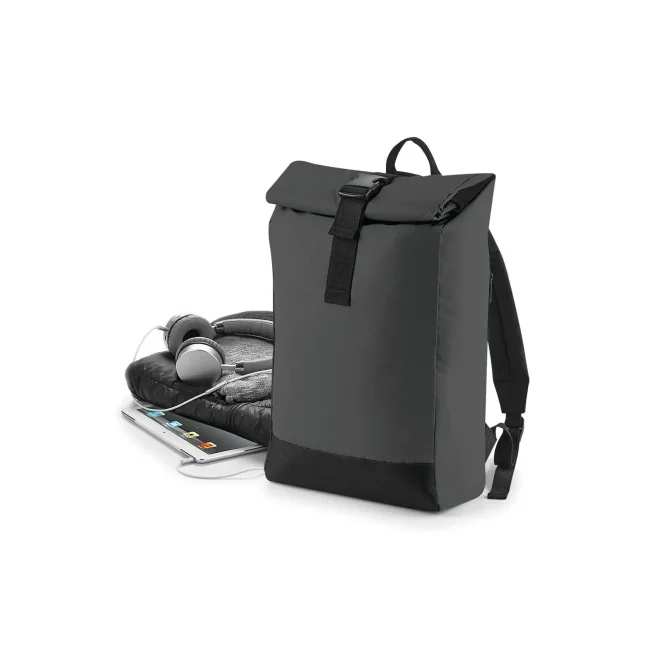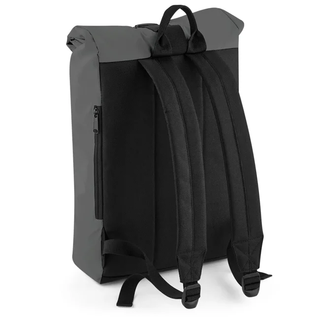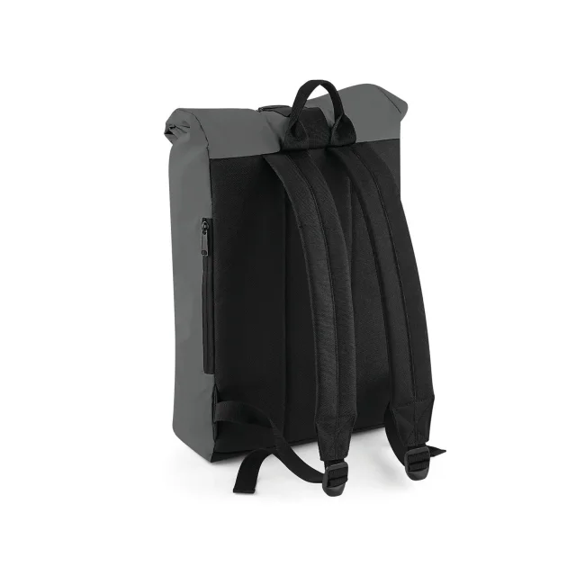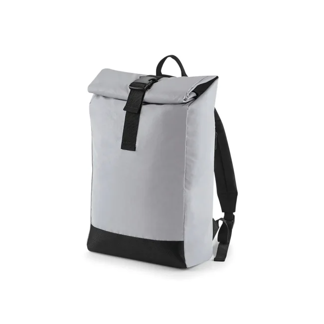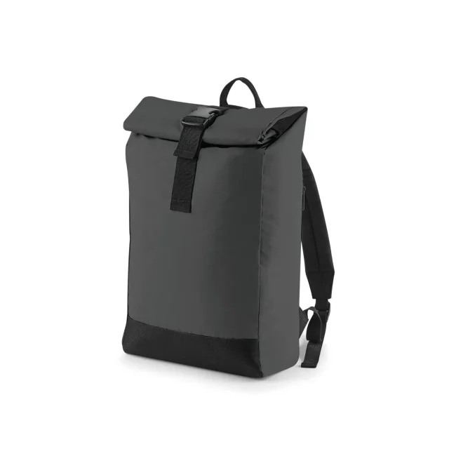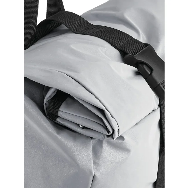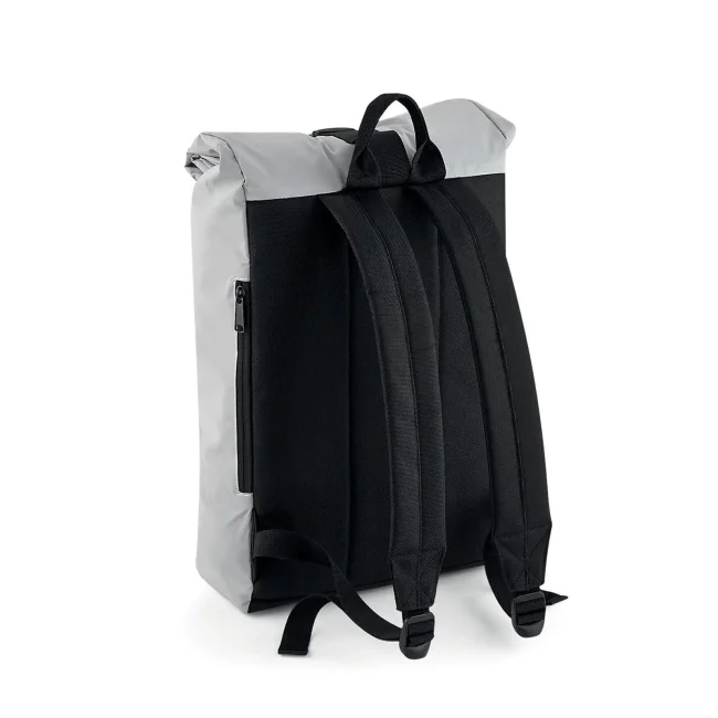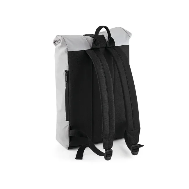 85% poliestere, 15% cotone. Zaino con tasca esterna nascosta con cerniera, riflettente al buio, bretelle imbottite regolabili. Dimensioni: 26 x 43 x 13 cm, capacita': 15 litri, area di stampa: 20 x 14 cm.
