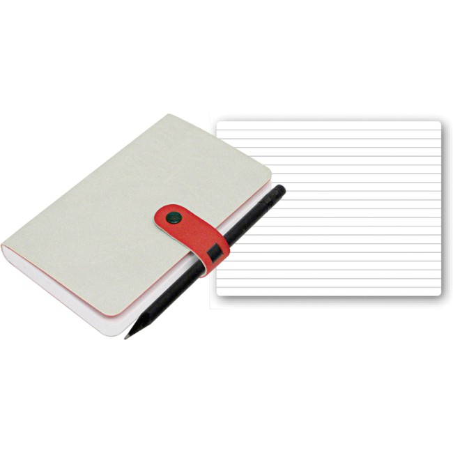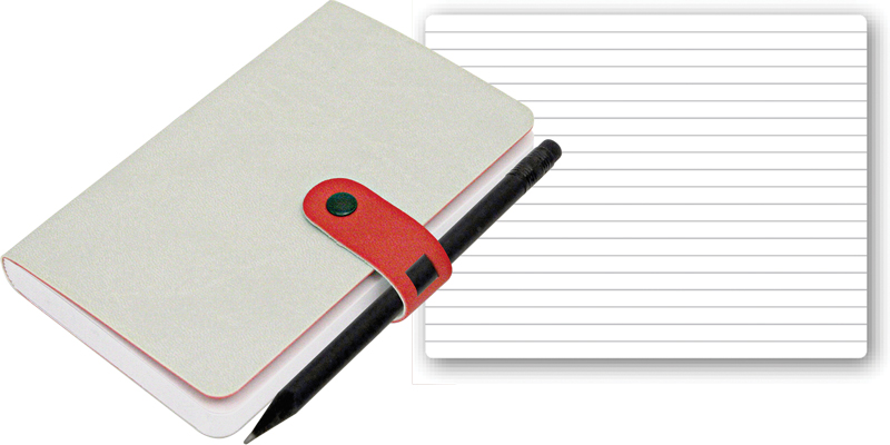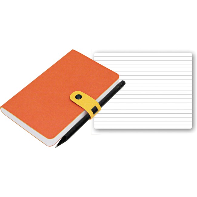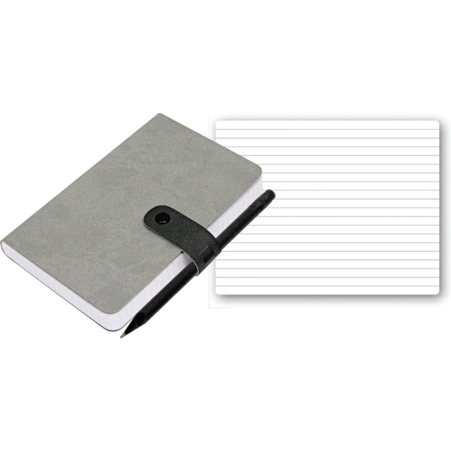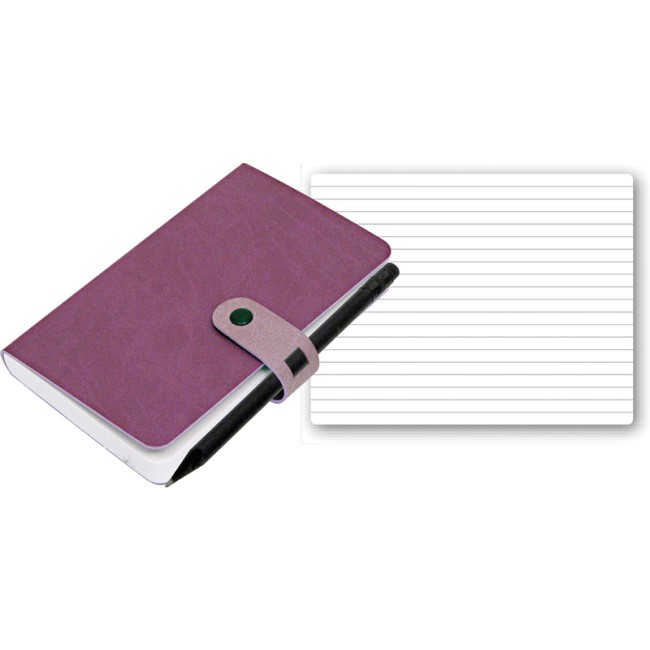 , notes con passante porta penna e con bottone, morbida a taglio vivo, dorso curvo e angoli tondi.