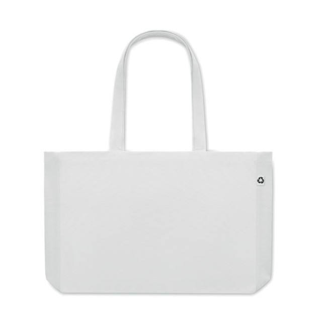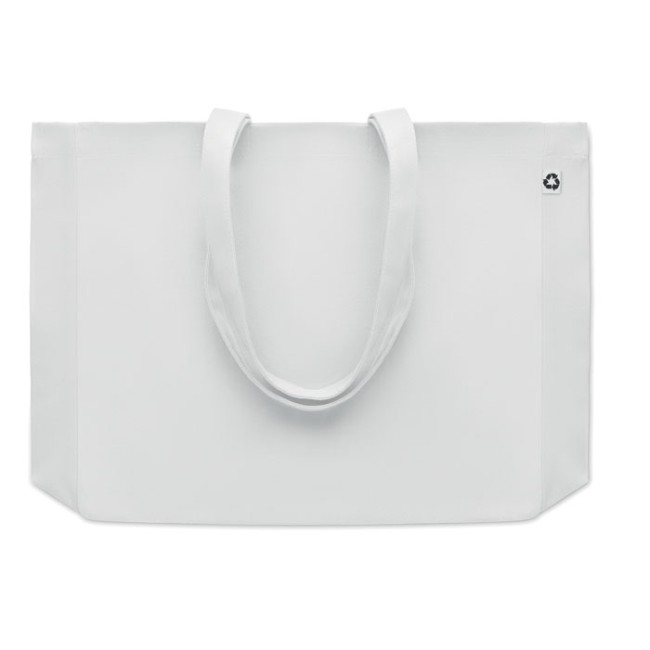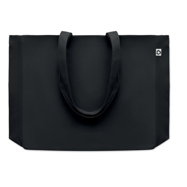 Borsa shopping o borsa da spiaggia in tela riciclata da 280 gr/m² disponibile in più colori. Questa tote bag ha manici lunghi per poterla portare a mano o sulla spalla per avere le mani libere. La base a soffietto la rende molto utile per portare con sé molti oggetti in spiaggia o quando si fa la spesa. La borsa è fatta al 50% di cotone e al 50% di cotone riciclato.