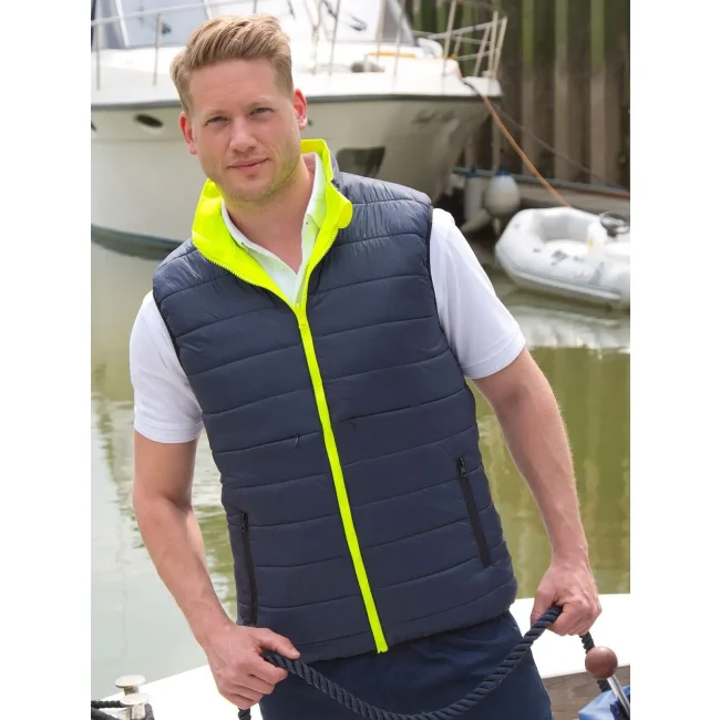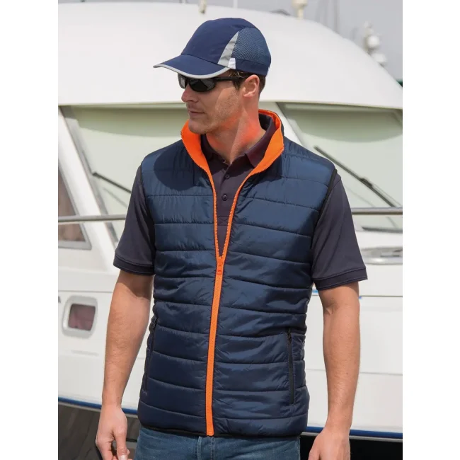 100% poliestere. Gilet con dettagli catarifrangenti, parte interna e zip di colore contrastante, giromanica e orlo morbido, due tasche con zip, colletto rialzato, leggero e caldo, nessuta etichetta.