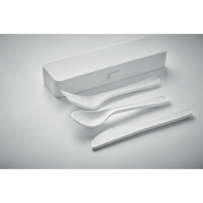 Set di posate portatili riutilizzabili in PP e custodia. Include cucchiaio, forchetta e coltello. I prodotti riutilizzabili contribuiscono a creare un pianeta più sano. Portate questo set di posate al tuo prossimo pasto all'aperto.