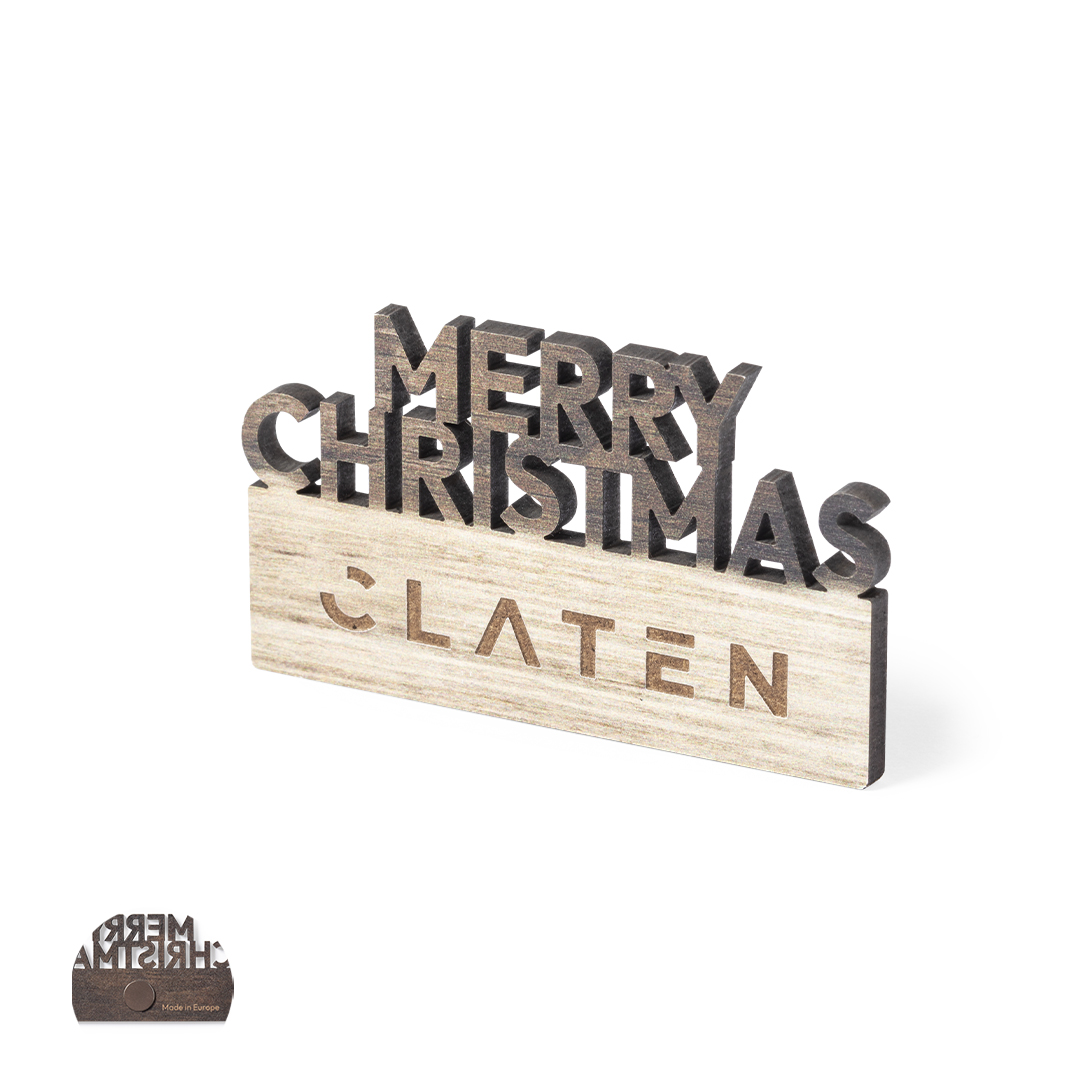 Originale calamita Merry Christmas in legno naturale, con testo fustellato e finitura originale bicolore. Ampia superficie per la stampa e logo Made In Europe.