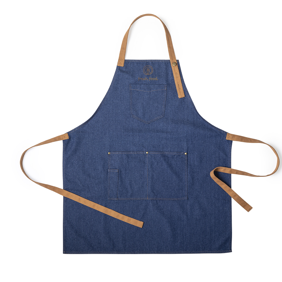 Grembiule di alta qualità in tessuto denim resistente. Tagliato sotto il ginocchio, con cinturino al collo regolabile con bottone, lacci marroni rinforzati in vita. Con una moltitudine di tasche per riporre comodamente gli utensili, cuciture rinforzate e rivetti in metallo.