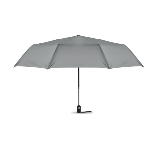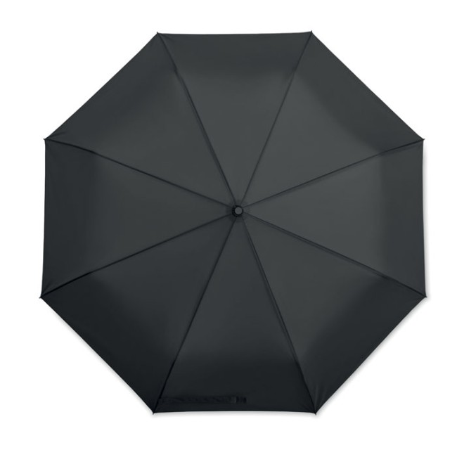 Ombrello antivento da 27 pollici a 3 pieghe con apertura/chiusura automatica. Materiale in pongee 190T, fusto in acciaio placcato nero. Stecche in fibra di vetro, struttura interna placcata in nero in 1 parte. Manico in PP nero con pulsante. Con custodia coordinata.