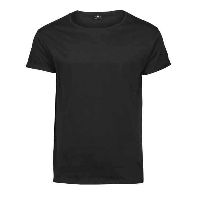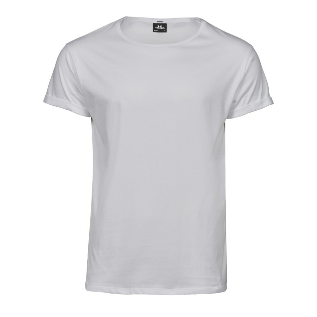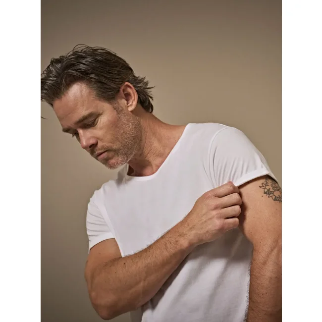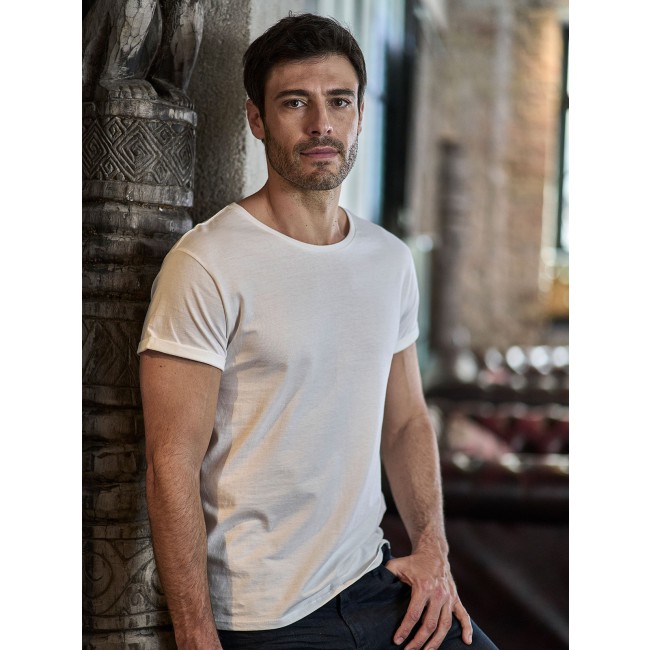 100% cotone single jersey, pettinato ringspun. T-shirt dalla vestibilità comoda, tessuto in cotone di qualità premium, maniche con roll-up, ampio girocollo con costina sottile. Cuciture laterali.