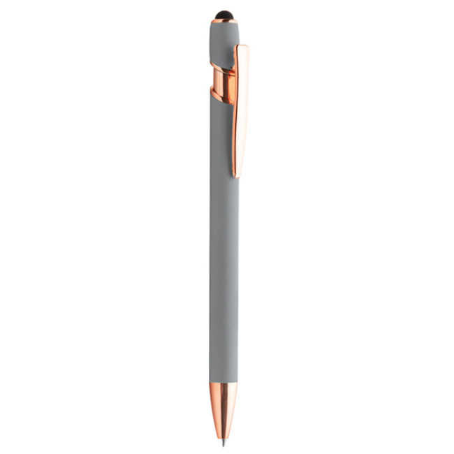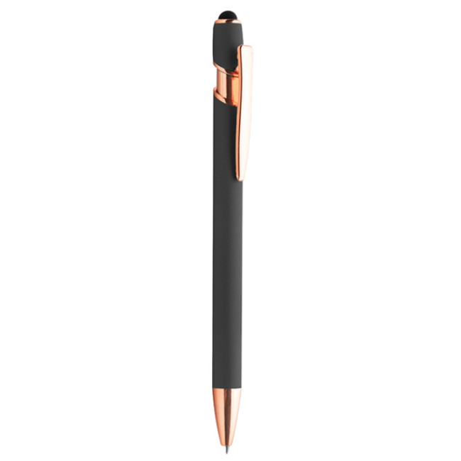penna a sfera in metallo meccanismo a scatto fusto in materiale soft touch minuteria in metallo oro rosato gommino touch refill nero