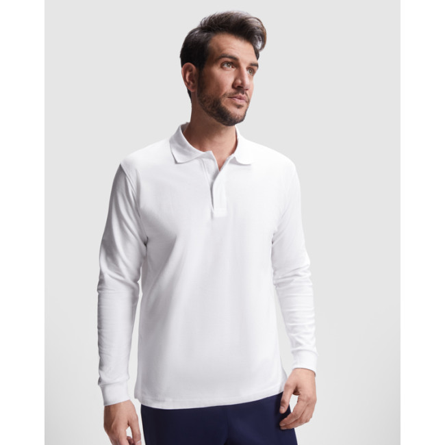 Polo a maniche lunghe.· Collo e polsini a costine 1x1.· Patta di chiusura in velcro. · Copri cuciture rinforzato sul collo. · Spacchetti laterali al fondo.