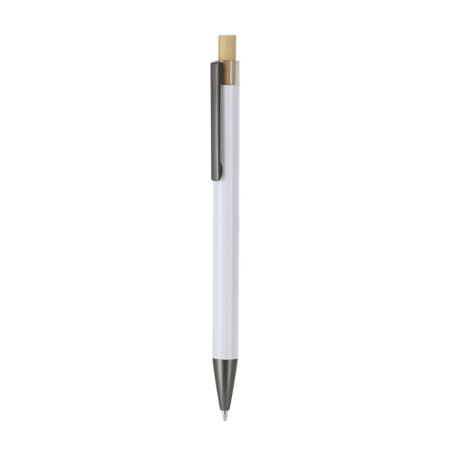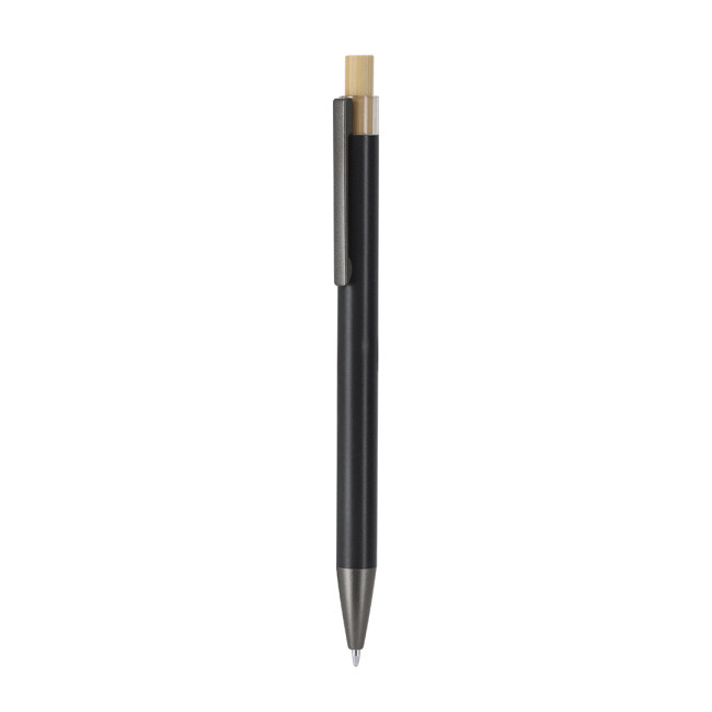 Penna a pulsante fatta di alluminio riciclato. Pulsante pulsante in bambù con corpo grigio opaco. Clip e punta nere. Carica Jumbo e con inchiostro blu.