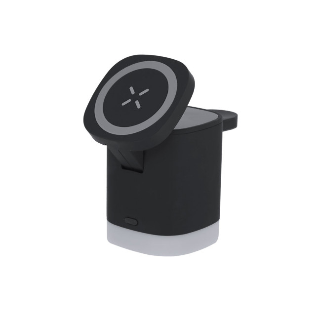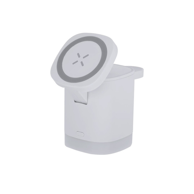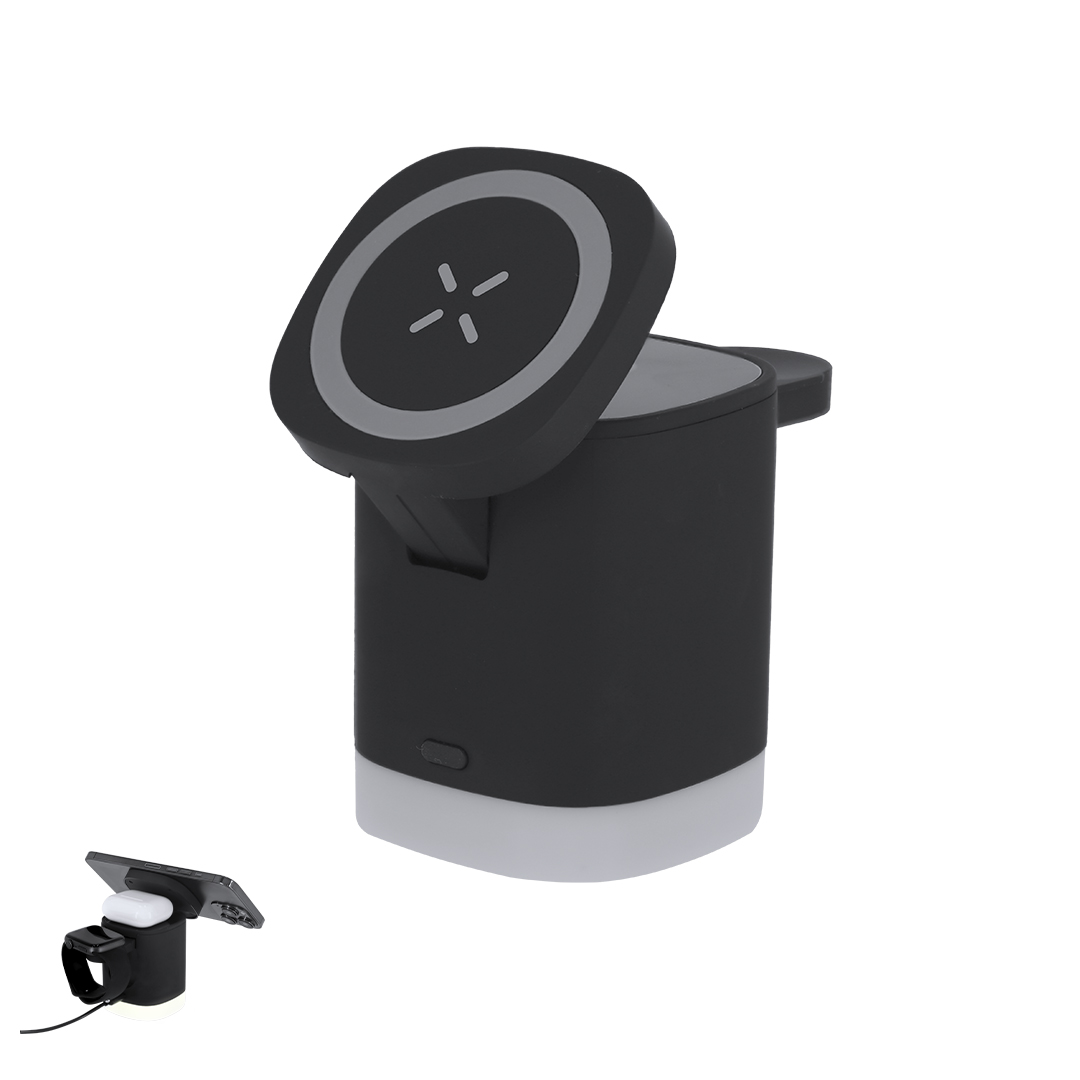 Caricatore wireless magnetico 3 in 1 da 15W, realizzato in ABS riciclato (RABS). Progettato per la ricarica simultanea dello smartphone, degli auricolari e dello smartwatch.Include lampada integrata nella base con 2 modalità di luce regolabili in bianco.Cavo di tipo C incluso. Un gadget tutto in uno: pieghevole, portatile, versatile e di design funzionale.Il RABS è una plastica altamente riciclabile di grande resistenza e con molteplici applicazioni che lo rendono una soluzione eco-friendly.Fabbricato secondo gli standard RoHS e in conformità con i seguenti requisiti di sicurezza:Sistema di protezione contro il surriscaldamento.Sistema di protezione contro il sovraccarico.Il sistema di bloccaggio per evitare cortocircuiti.