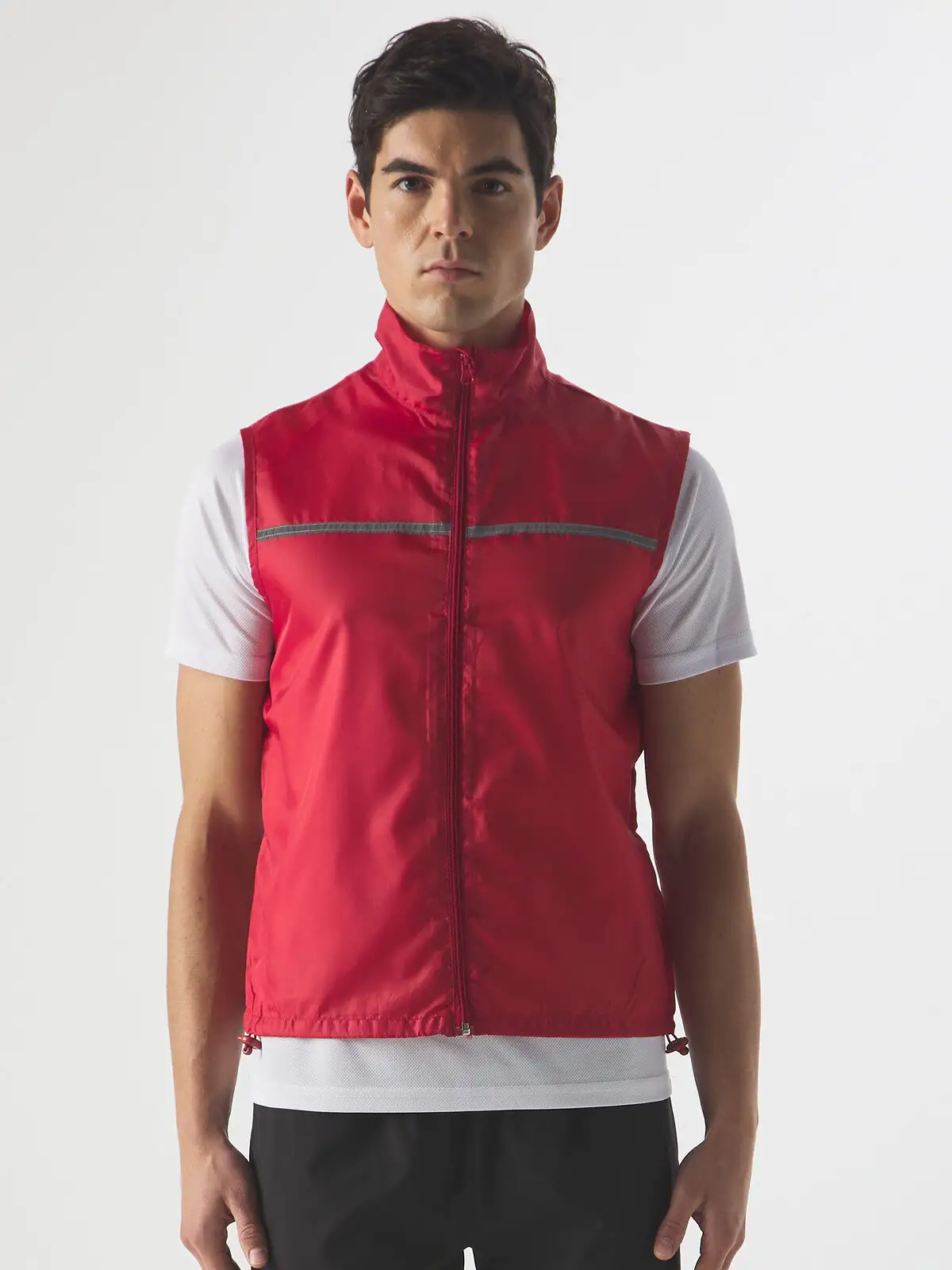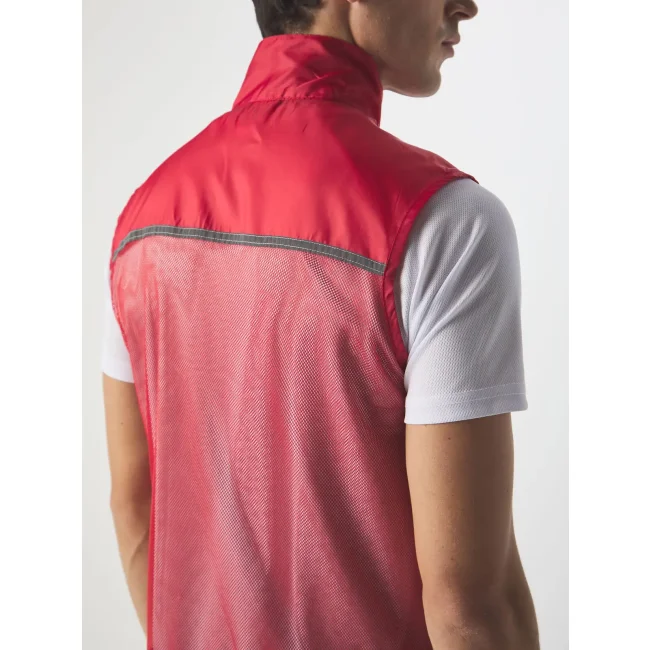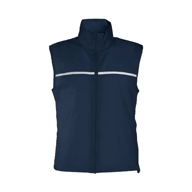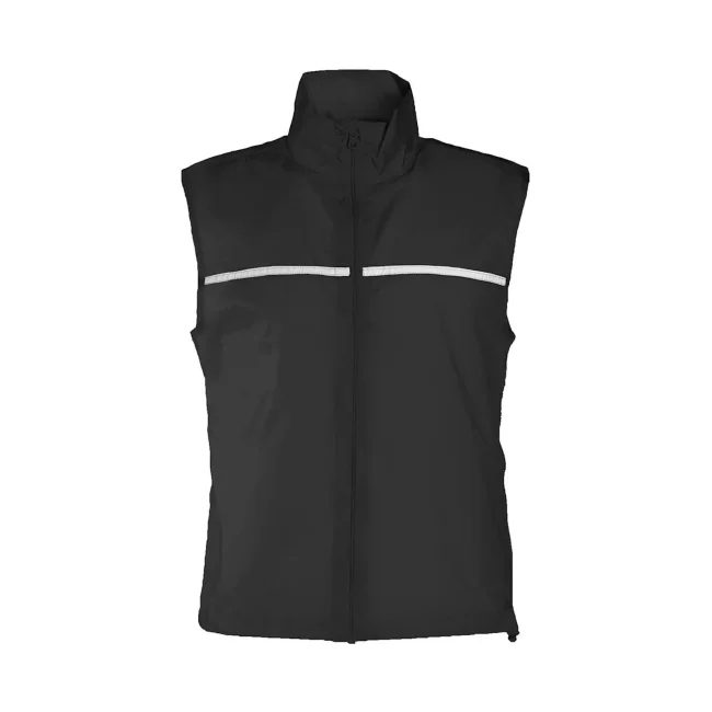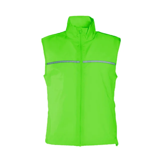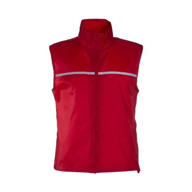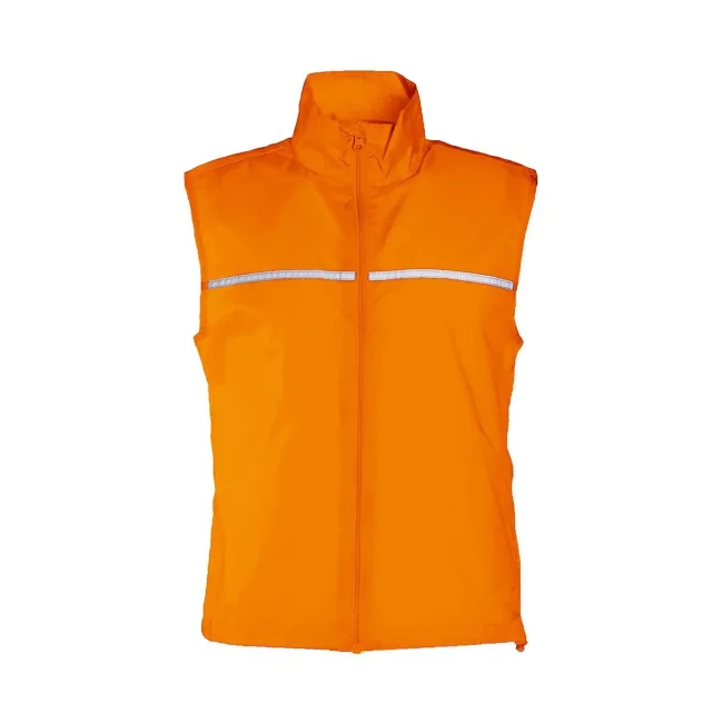 100% poliestere. Giacca smanicata antivento, unisex, rete nella schiena. Inserti catarifrangenti sia davanti che dietro. Zip intera tono su tono, taschina interna lato sinistro, cordoncino in vita con stopper. Etichetta strappabile.