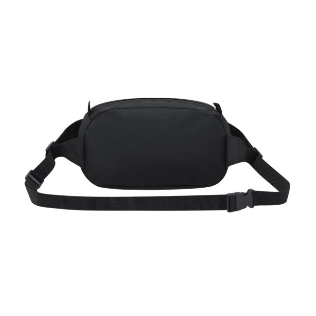Sac banane realizzato in poliestere RPET 600D, dotato di compartimento principale con chiusura a zip invisibile e sacca regolabile. Include un cordino elastico e l'etichetta distintiva RPET, rendendolo una scelta ecologica e pratica.