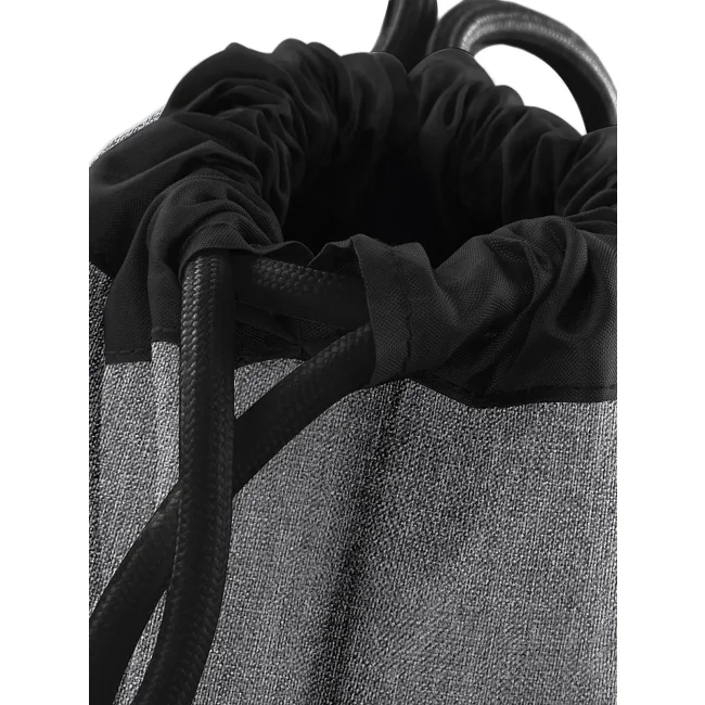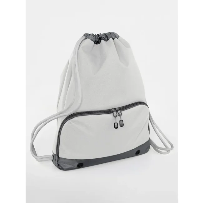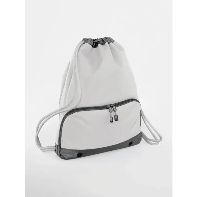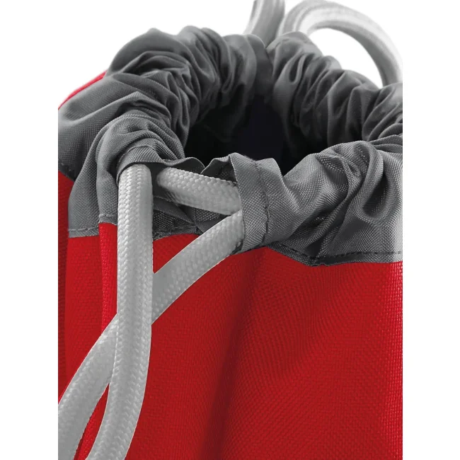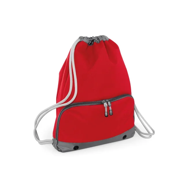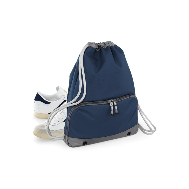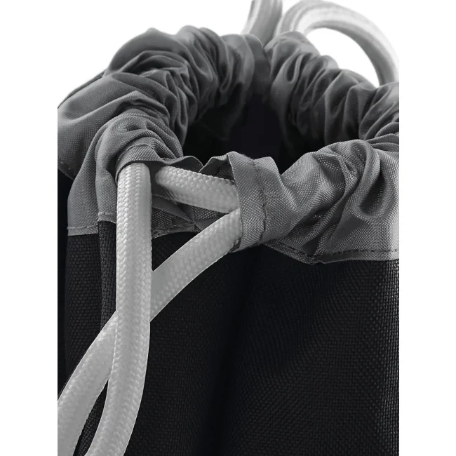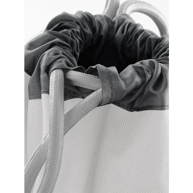 Sacca Athleisure Gymsac realizzata in 100% poliestere combinato 600D/420D, progettata con un compartimento impermeabile per scarpe e coulisse con cordoncini spessi. Le dimensioni sono 35 x 49 x 9 cm, con una capacità di 18 litri e un'area stampabile di 31 x 11 cm.