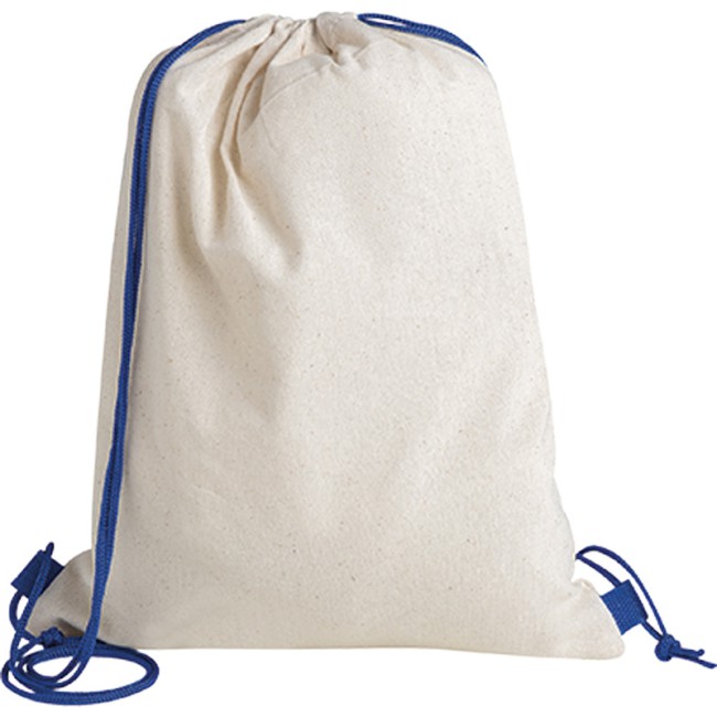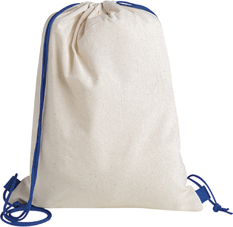 Sacca zaino, cotone colore naturale, doppia corda di chiusura, con laccetti colorati.