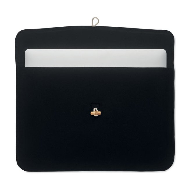 Custodia imbottita per laptop da 15 pollici, realizzata in cotone da 220 gr/m² con fodera interna di 120 gr/m². La chiusura è dotata di bottoni in bamboo, offrendo un tocco naturale e funzionale. Questa custodia è ideale per proteggere il tuo dispositivo durante il trasporto.