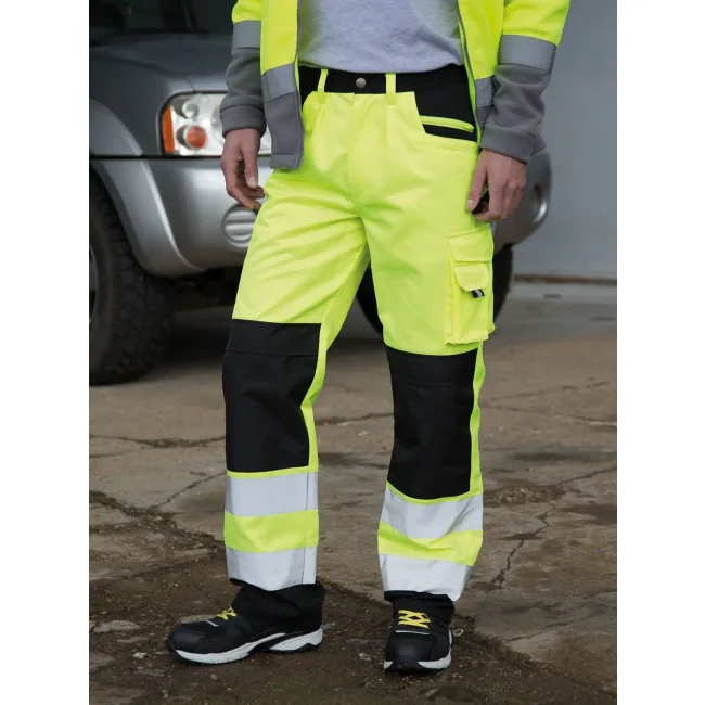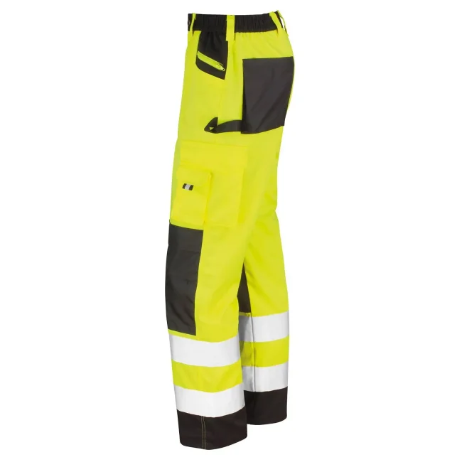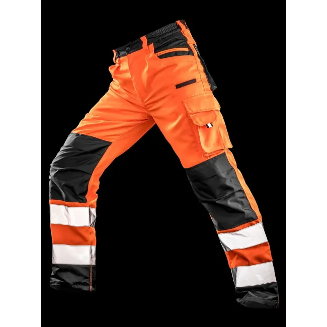 80% poliestere 20% cotone twill. Pantaloni con girovita leggermente elasticizzato con passanti, zip frontale con bottone, tasche posteriori, spacco e zip su tasche frontali, pannelli a contrasto neri, rinforzi sui punti di stress, bande riflettenti sulla gamba, tasca laterale, tasche per ginocchiere. EN ISO 20471:2013 CLASS 2, GO/RT 3279 ISSUE 8:2013 CLASS 2 (arancione).