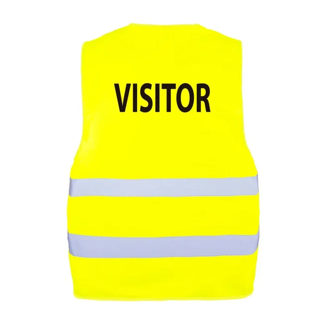 100% poliestere. Gilet di sicurezza "Passau", EN ISO 20471:2013/A1:2016, con stampa "Visitor", due strisce riflettenti larghe 5 cm attorno al corpo, misura regolabile con due chiusure in velcro. Il produttore garantisce le proprietà riflettenti secondo la norma EN per 25 cicli di lavaggio a 40°C, l'EAN/codice a barre può essere scansionato nell'etichetta, confezionati singolarmente.