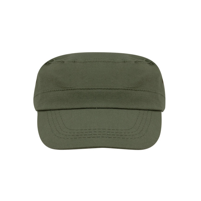Cappellino in stile militare cotone pettinato e colori sobri. Con fori di ventilazione laterali rinforzati da occhielli metallici e chiusura regolabile con velcro.