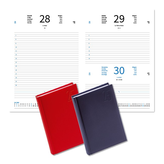 Agenda giornaliera con sabato e domenica abbinati. Carta bianca certificata FSC da 60 gr, 320 pagine.