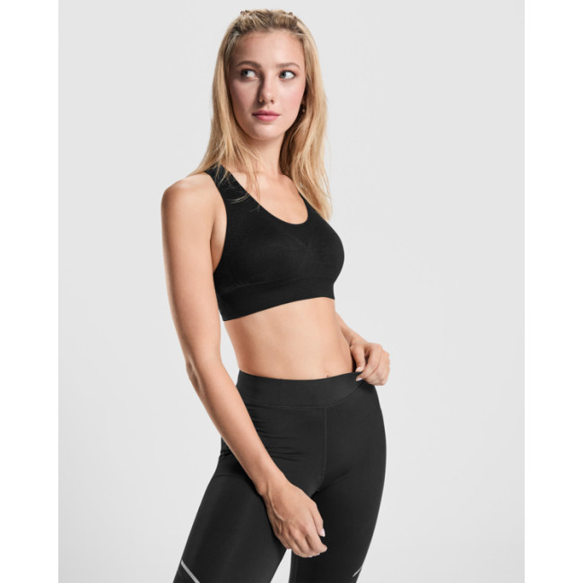 Top sportivo traspirante ed elastico senza cuciture in tessuto jacquard. Senza cuciture. Scollo rotondo e dorso a vogatore con bordatura.