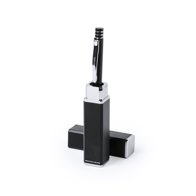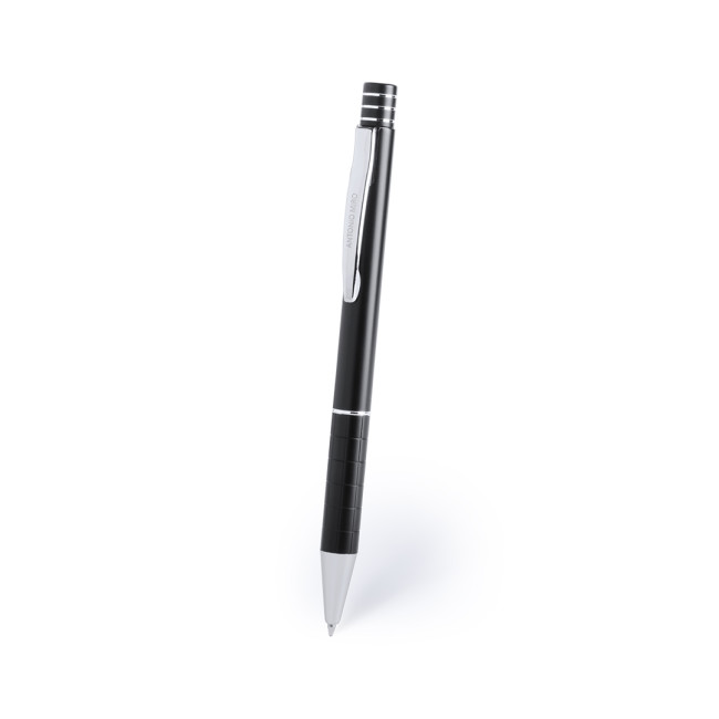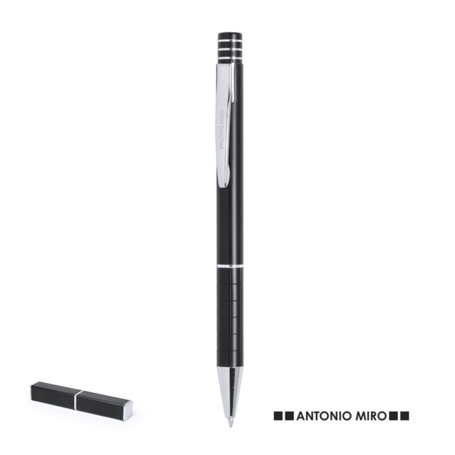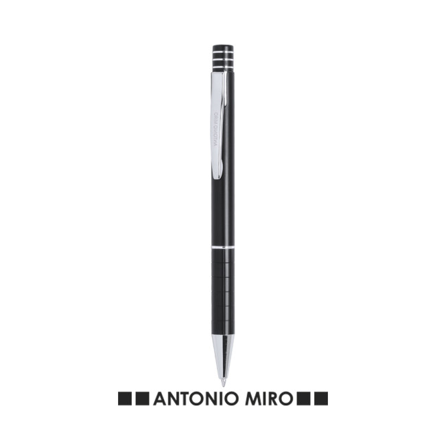 Penna by Antonio Miró dal design elegante e dal fusto in alluminio liscio con finiture color argento. Meccanismo a pulsante, con parte superiore ad anelli, clip originale in metallo e presentata in astuccio individuale in alluminio nero con logo del marchio. Inchiostro blu.