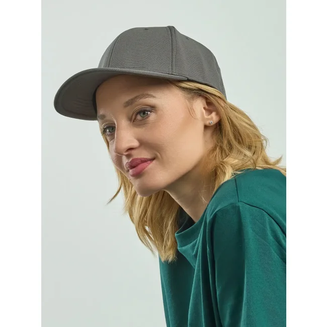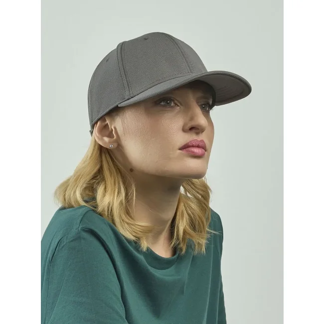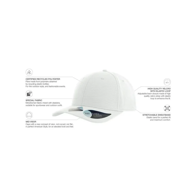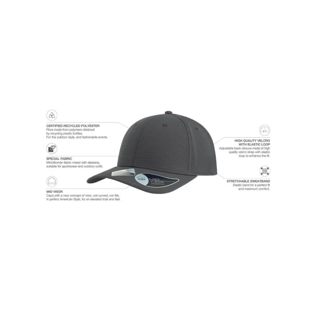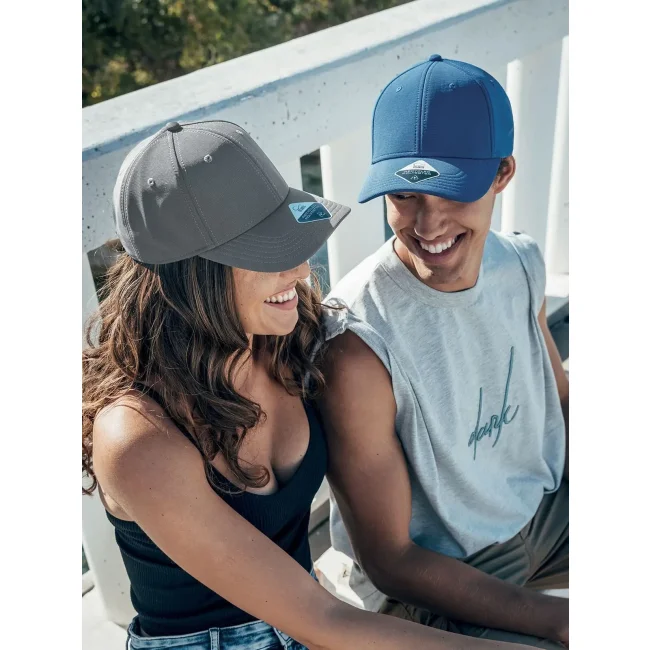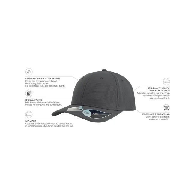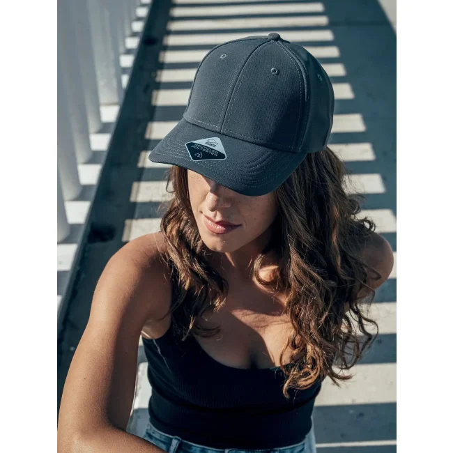 95% poliestere riciclato, 5% elastan. Cappellino a 6 pannelli in poliestere riciclato, visiera precurvata e occhielli ricamati, 6 cuciture sulla visiera, etichetta removibile.