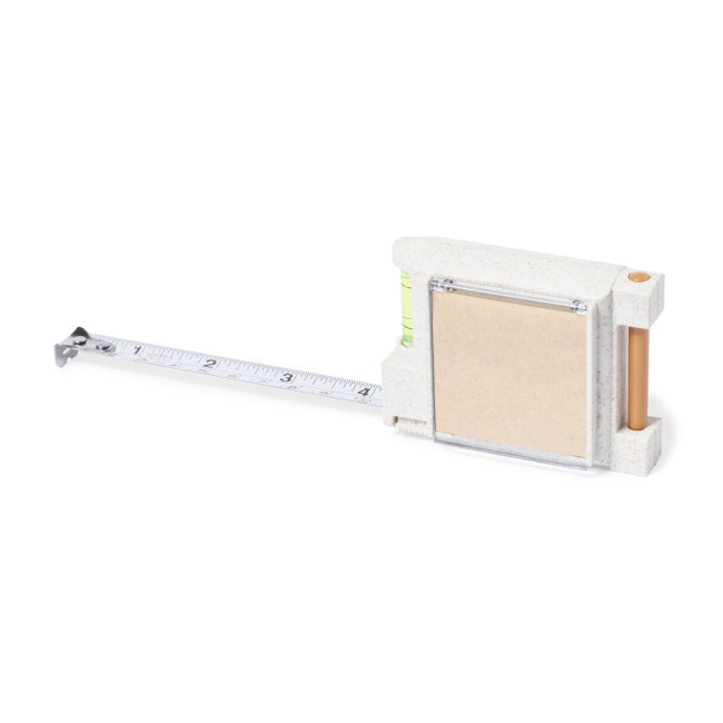 Flessometro da 3 m della linea natura multifunzione, con corpo in canna di grano. Con livella integrata, portapenne (penna inclusa) e blocco con 12 foglietti adesivi in colore naturale. Con freno, clip da cintura in metallo e misure in centimetri e pollici. Confezionato singolarmente in una scatola dal design kraft.La fibra di grano promuove l'utilizzo di materie prime naturali, riducendo così le emissioni inquinanti.